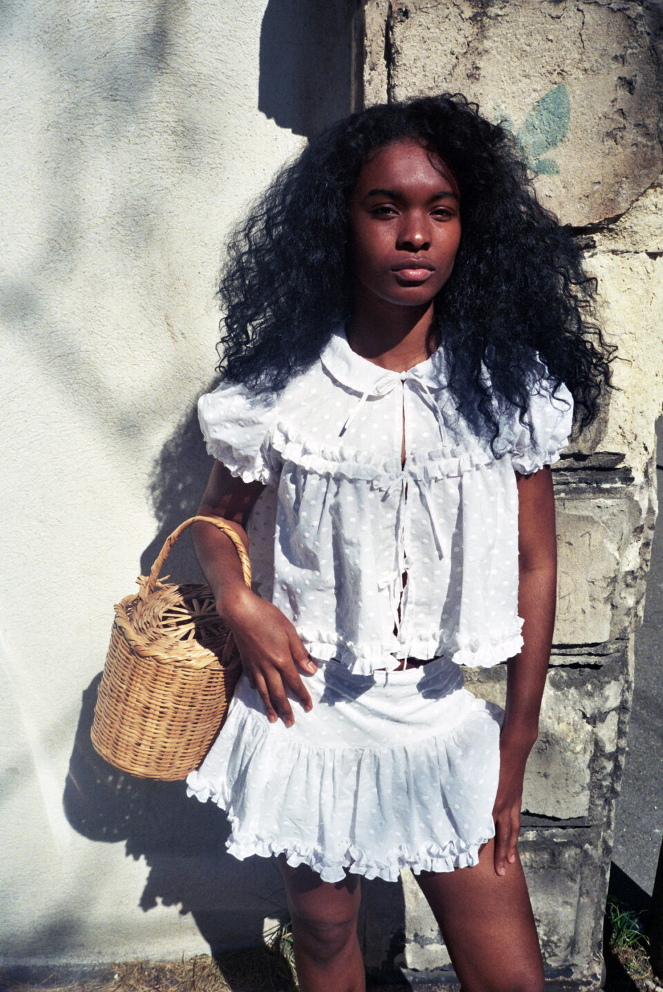 Blouse en coton et dentelle fleurie antique avec froufrous