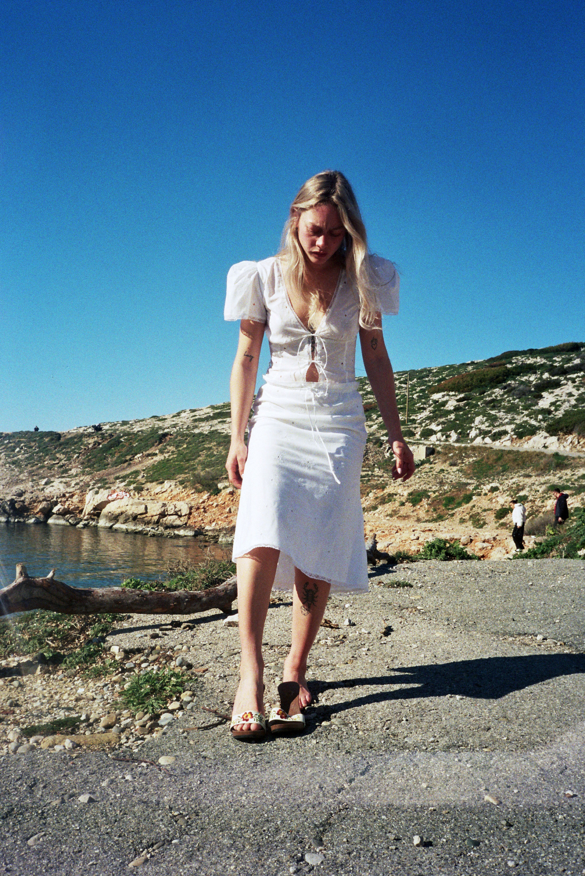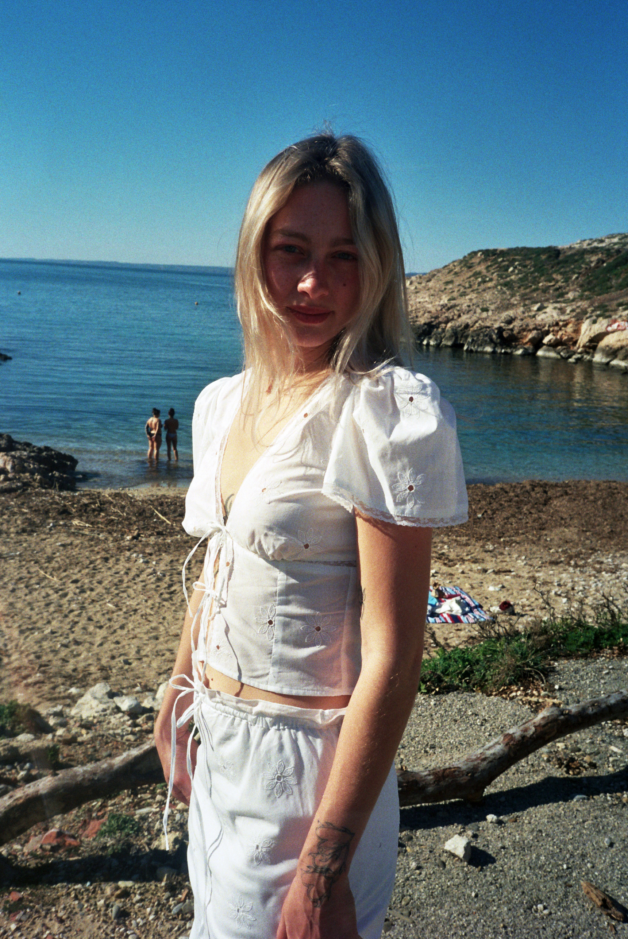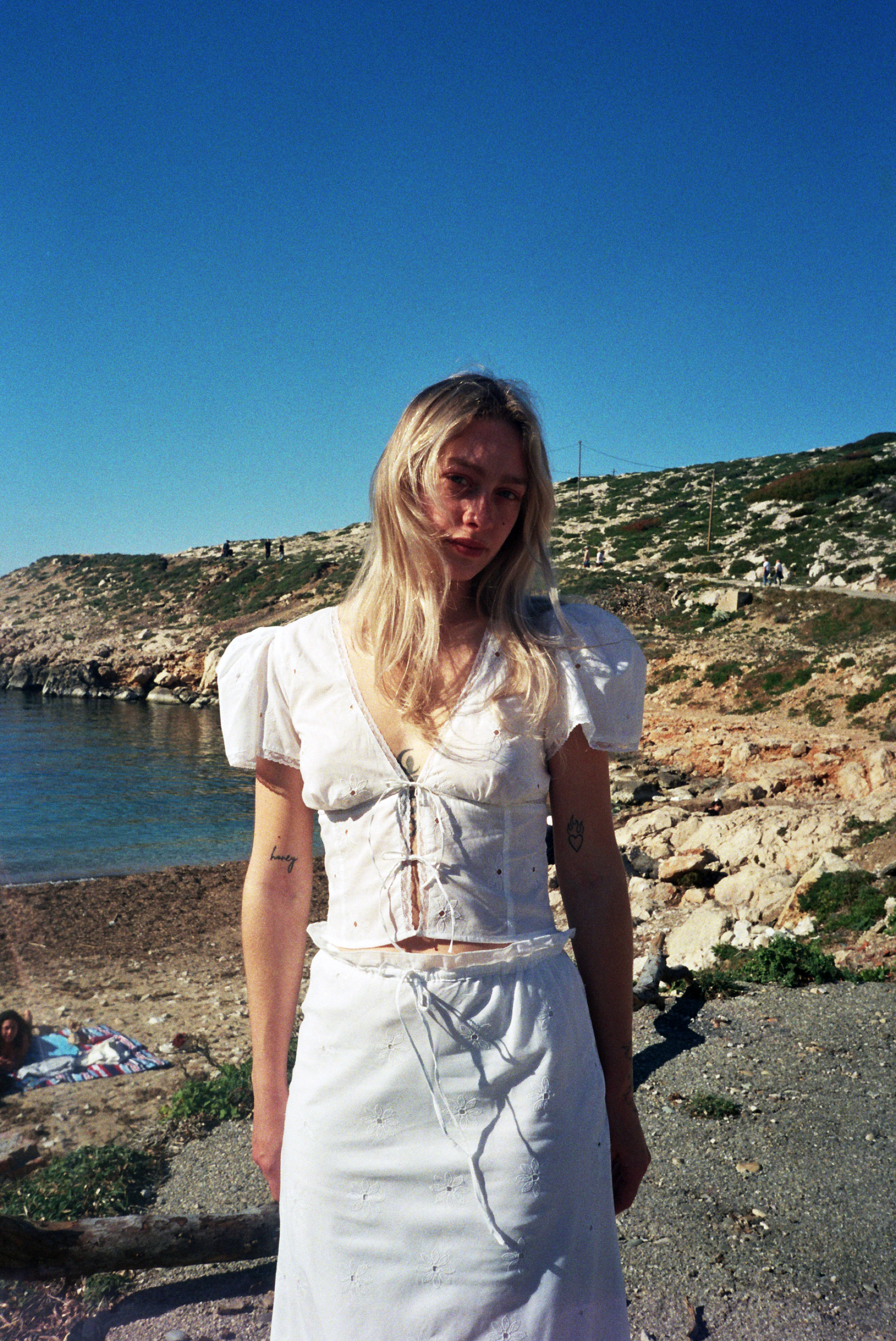 Jupe mi-longue évasée en coton brodée petite fleurs, taille haute, taille élastiquée. 100% coton.