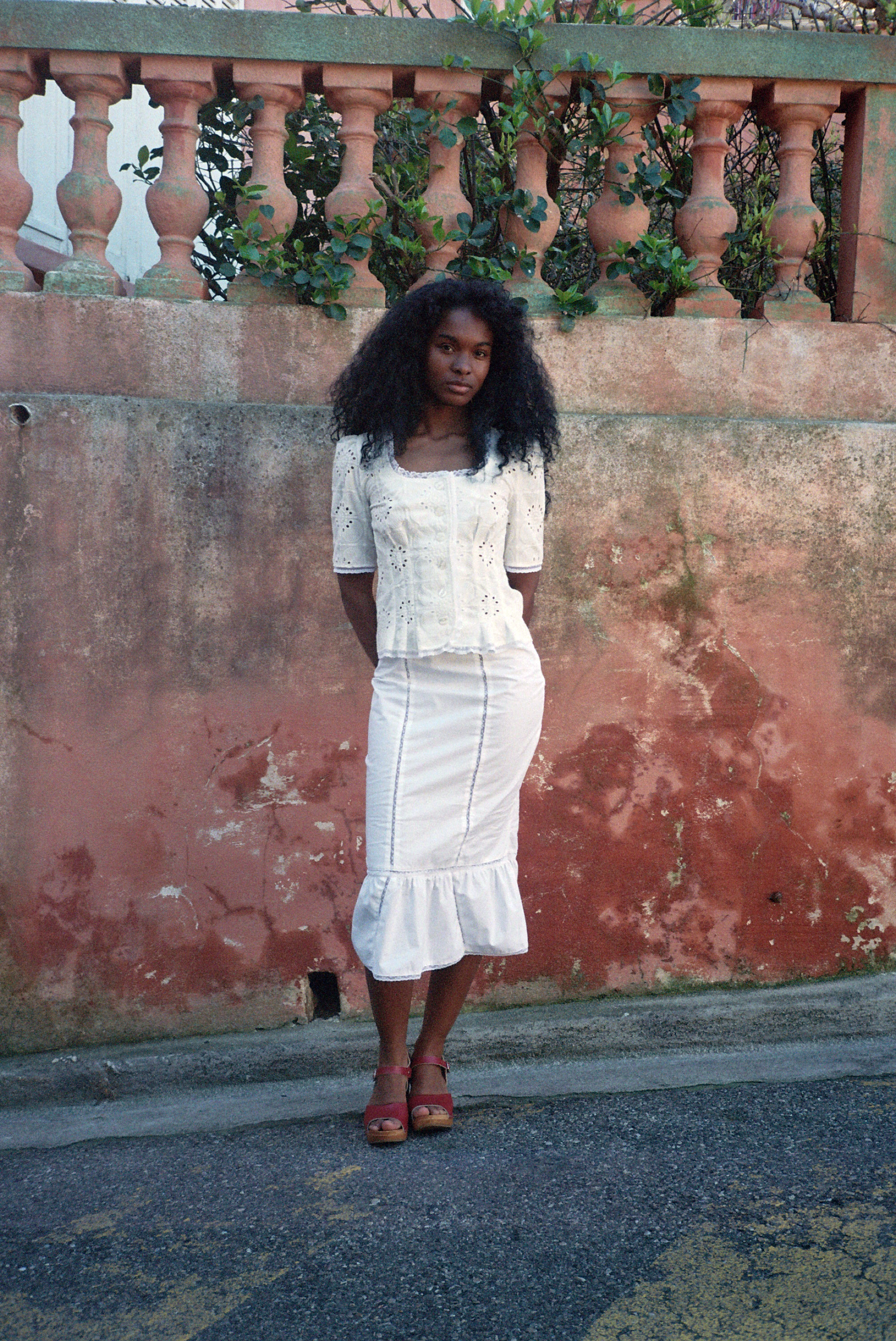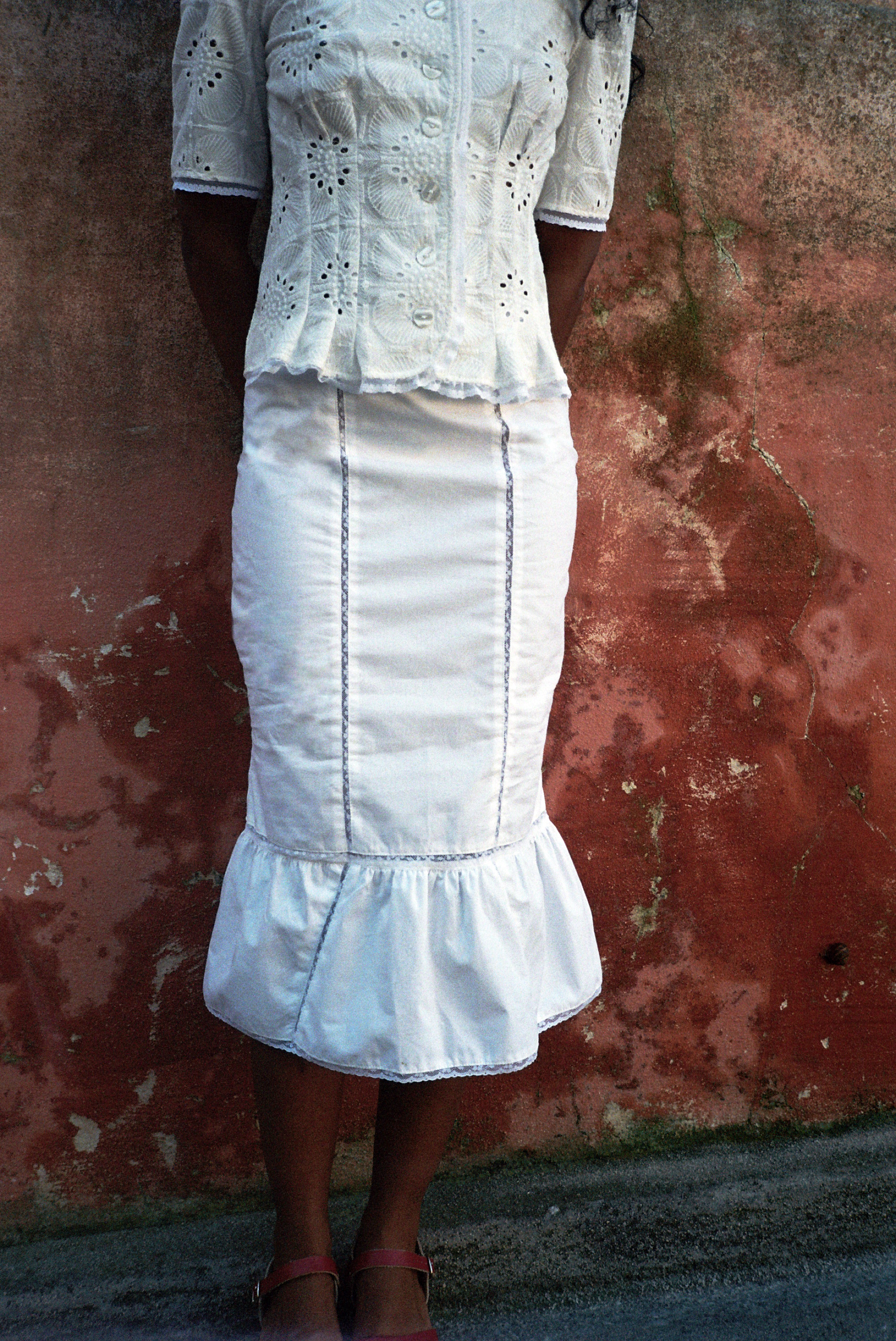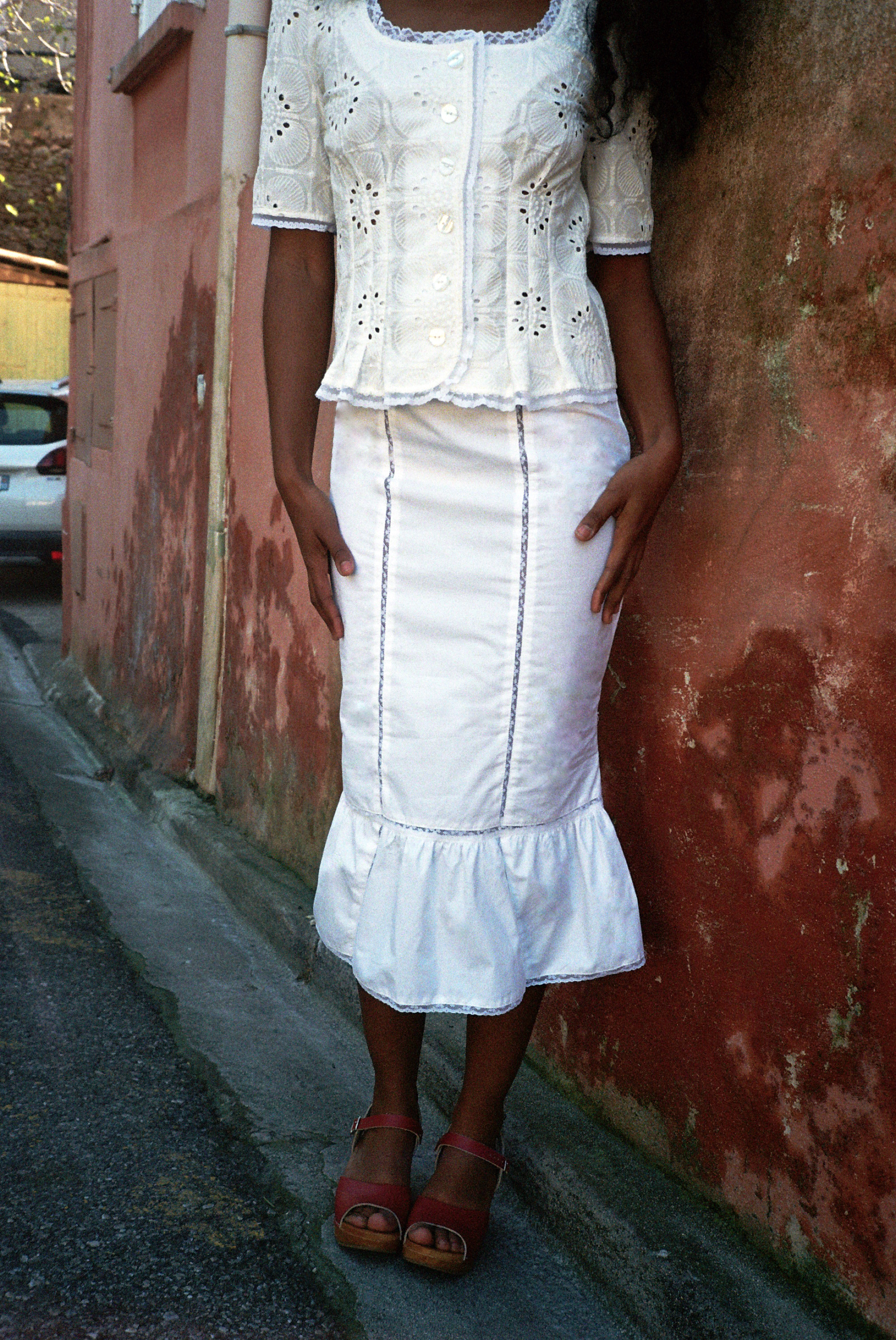 Jupe sirène en coton blanc et dentelle de Calais fleurie.
