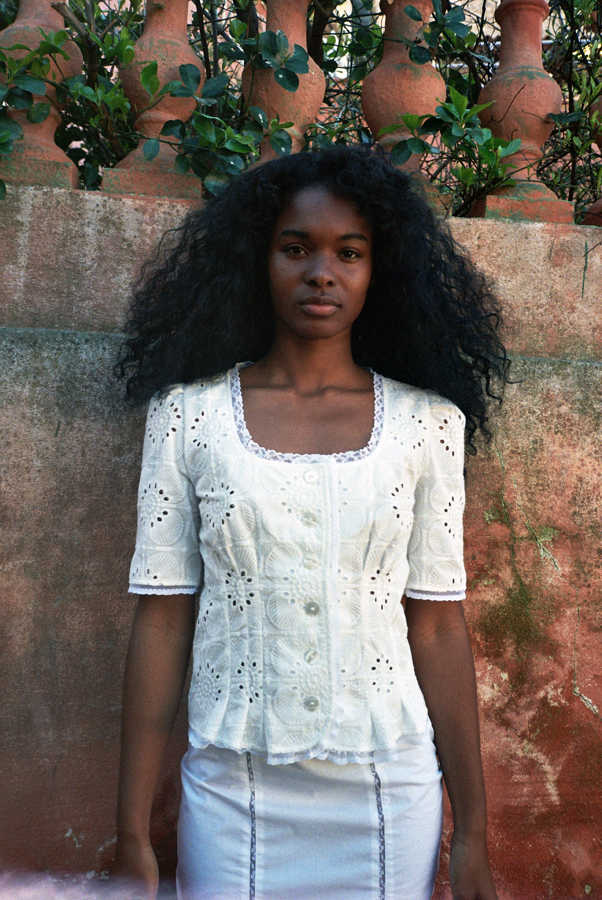 Blouse blanc cassé en coton de broderie anglaise fleurie.
