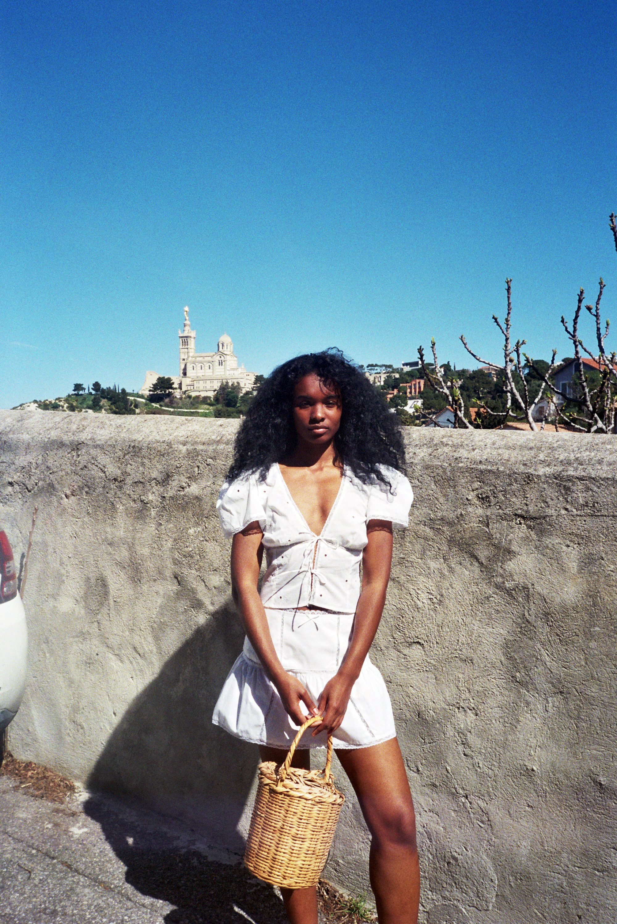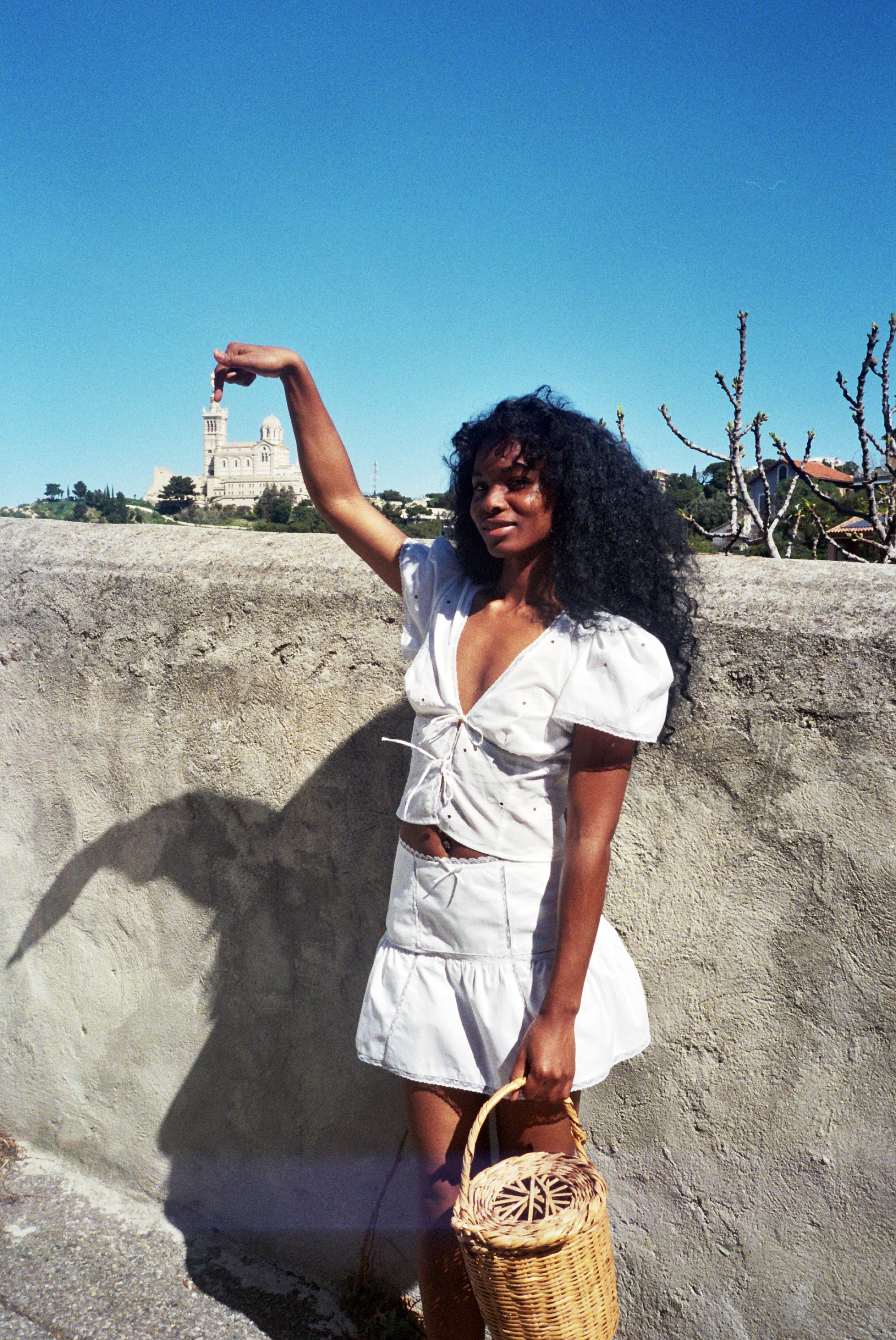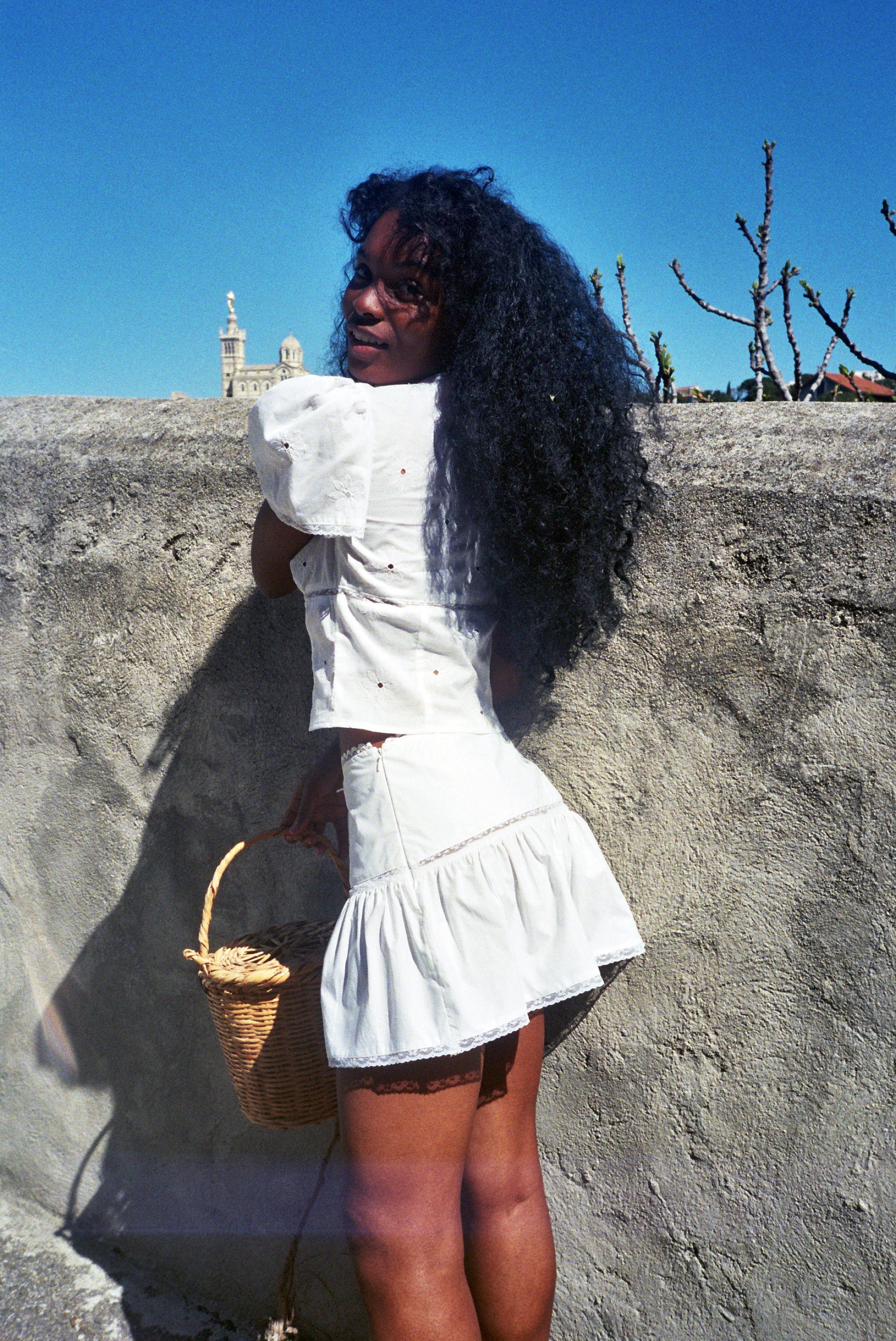 Jupe évasée en coton blanc et dentelle de Calais fleurie, taille haute, fermeture éclair invisible sur le côté. 100% coton. Sublime et délicate véritable dentelle de Calais fleurie. petit noeud sur la taille.