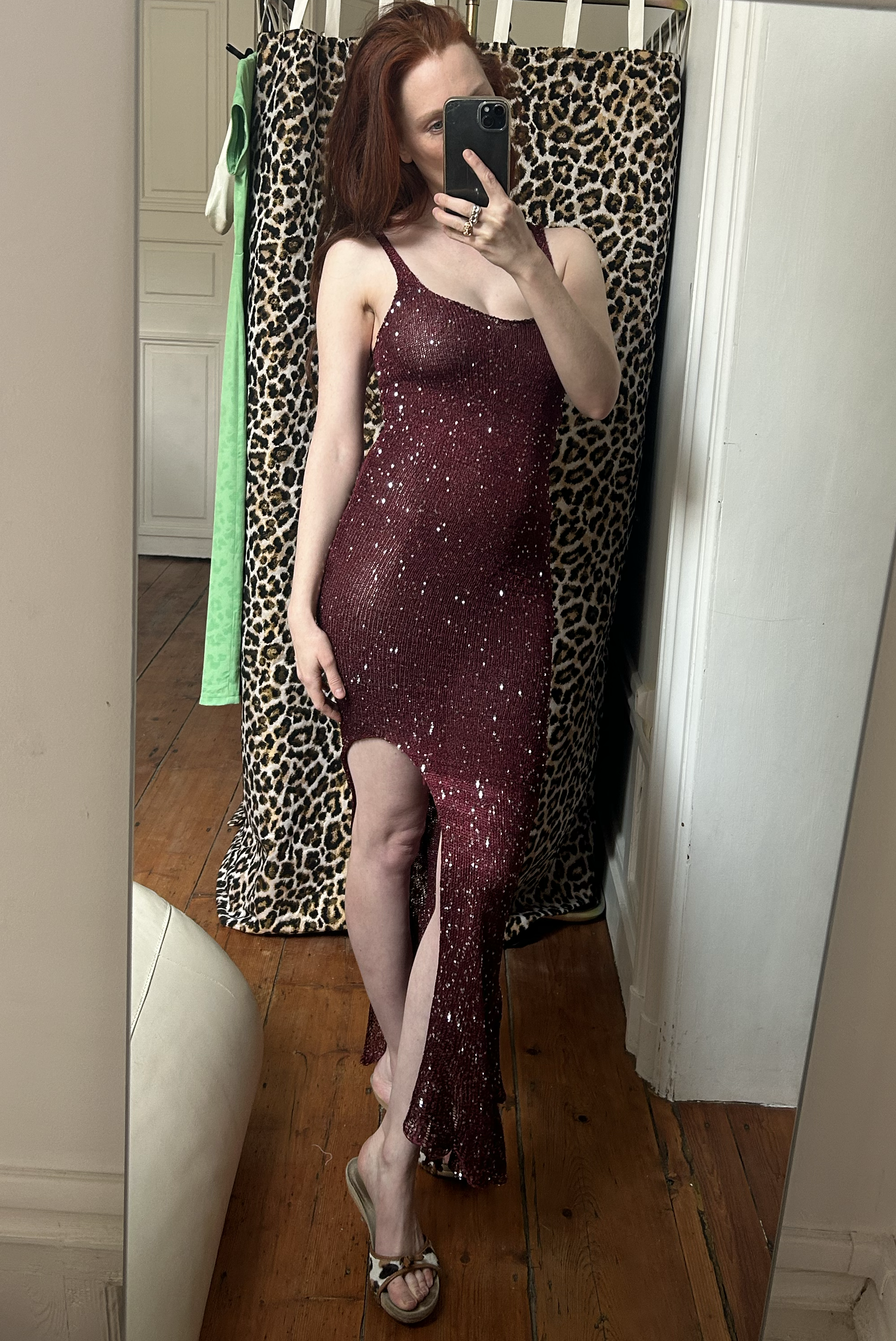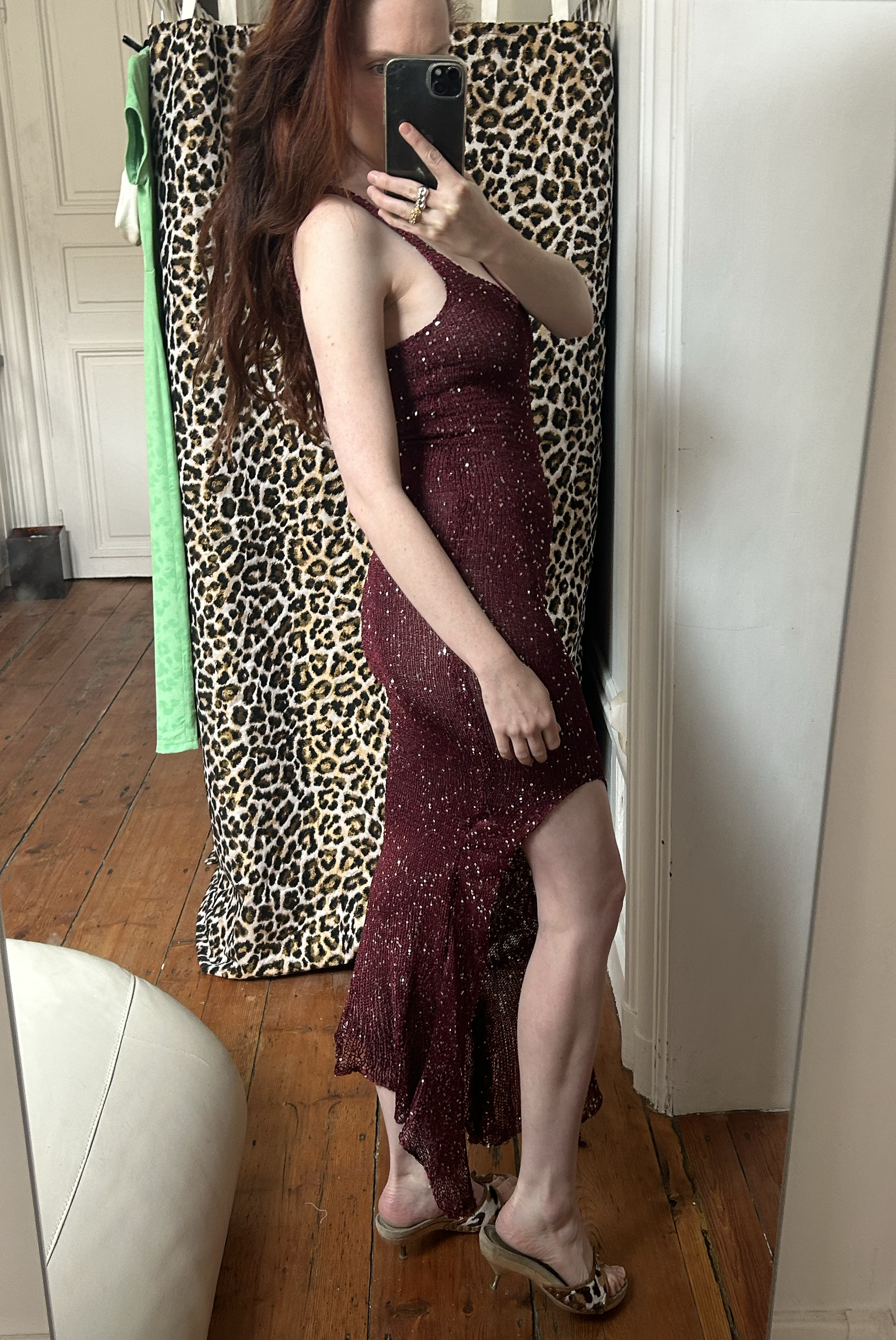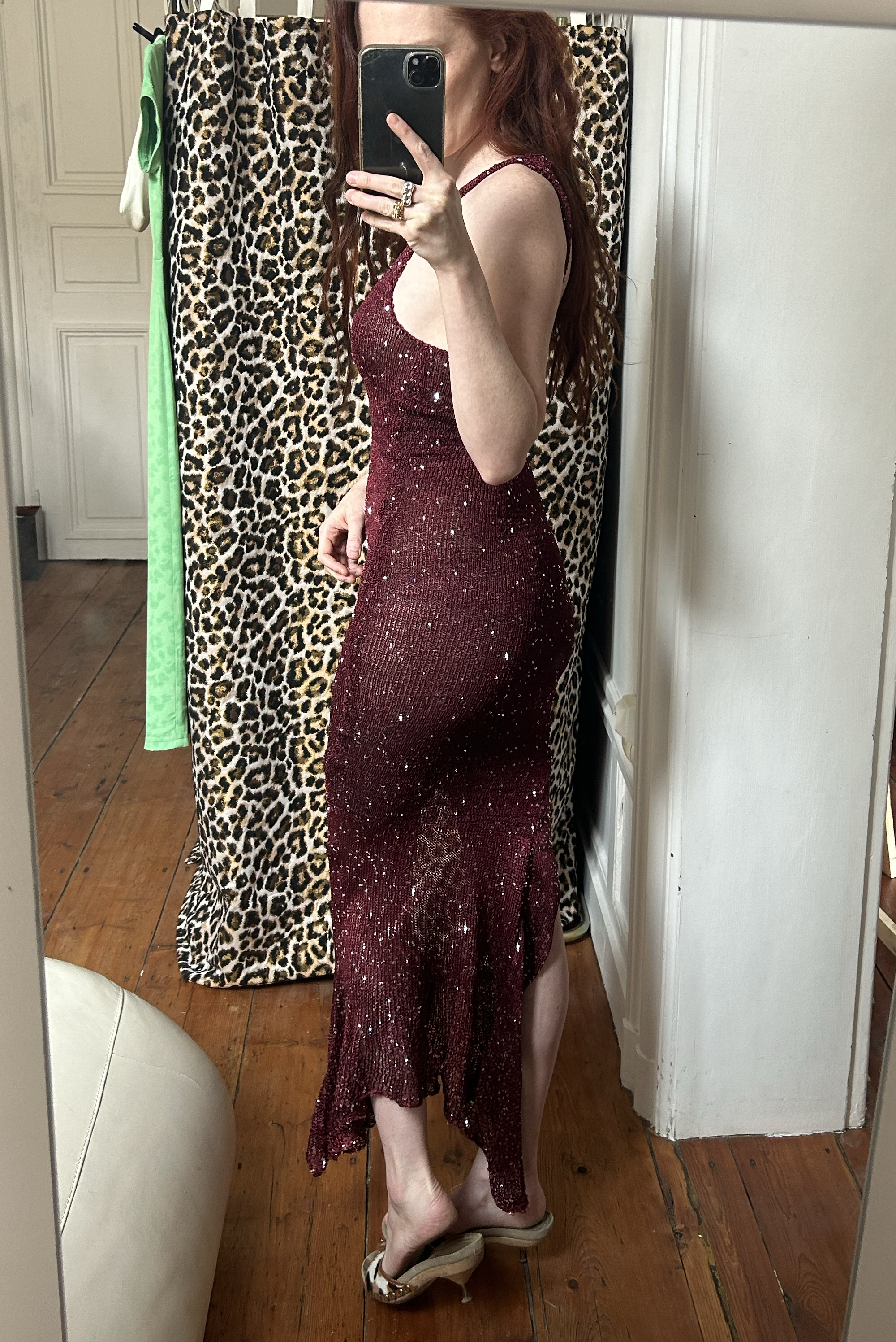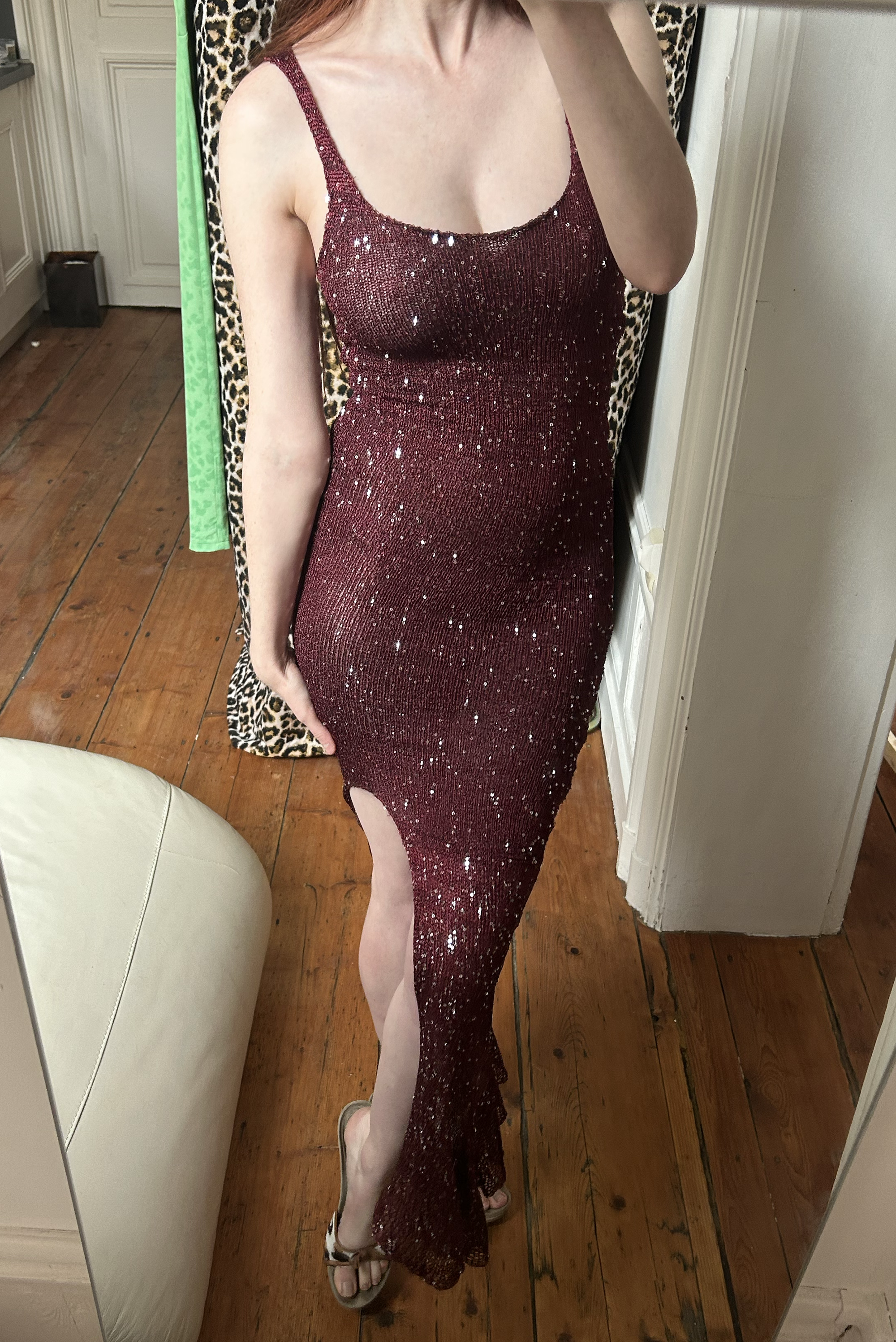Robe longue sirène tricotée bordeaux avec fil à sequins. Avec ses bretelles mi-larges bretelles et son décolleté arrondi, sa forme sirène assure une coupe flatteuse pour s’ajuster naturellement sur vos courbes.
