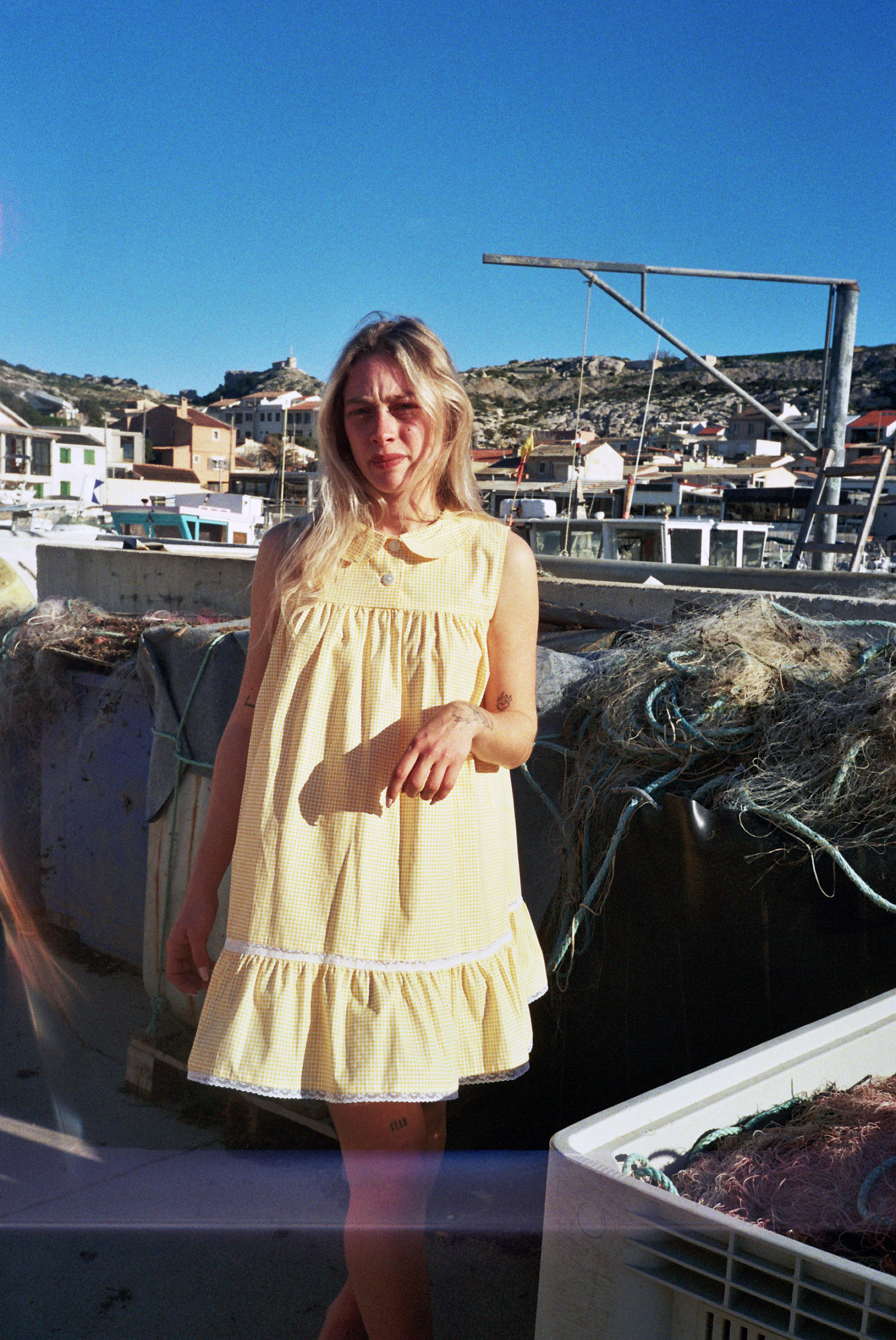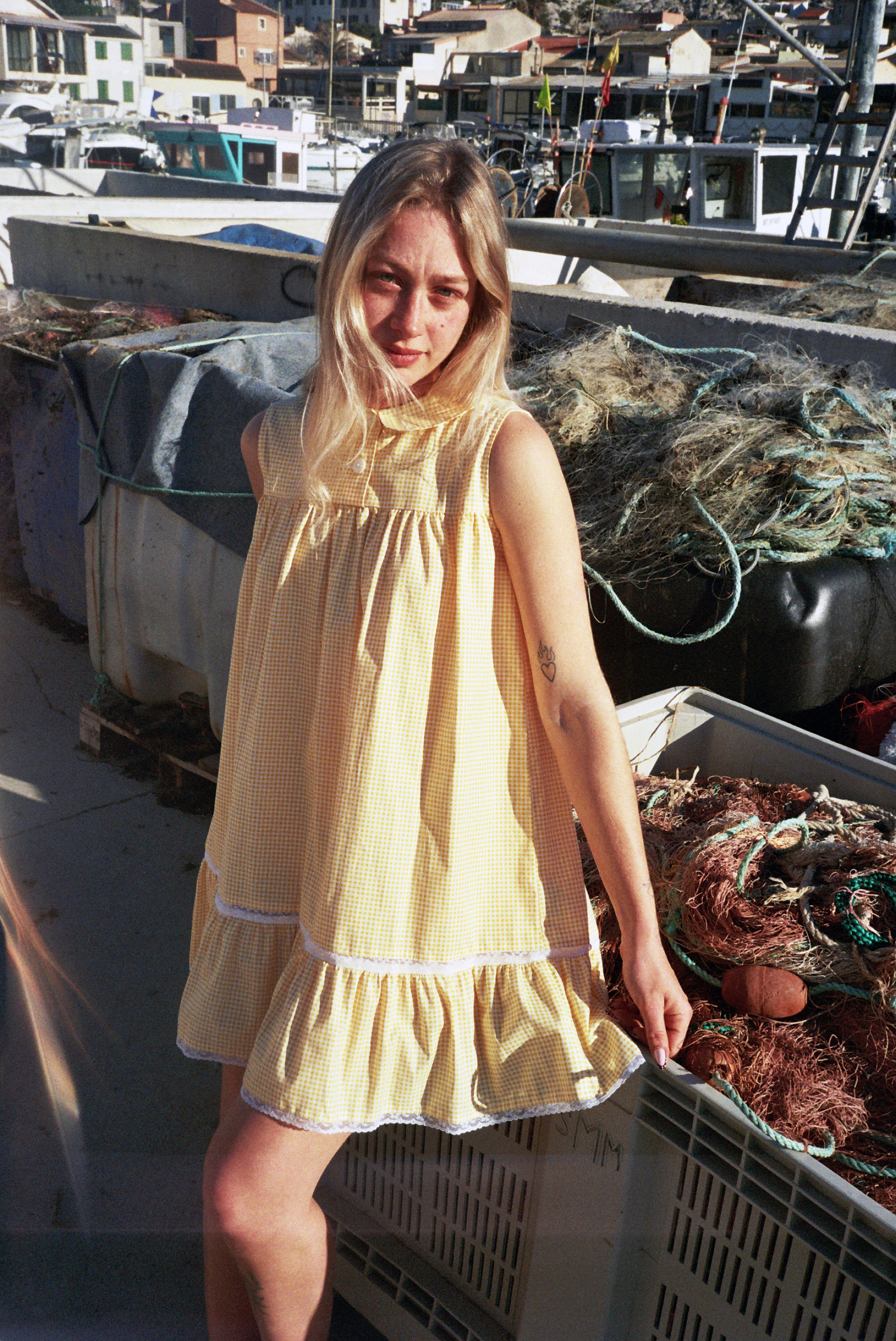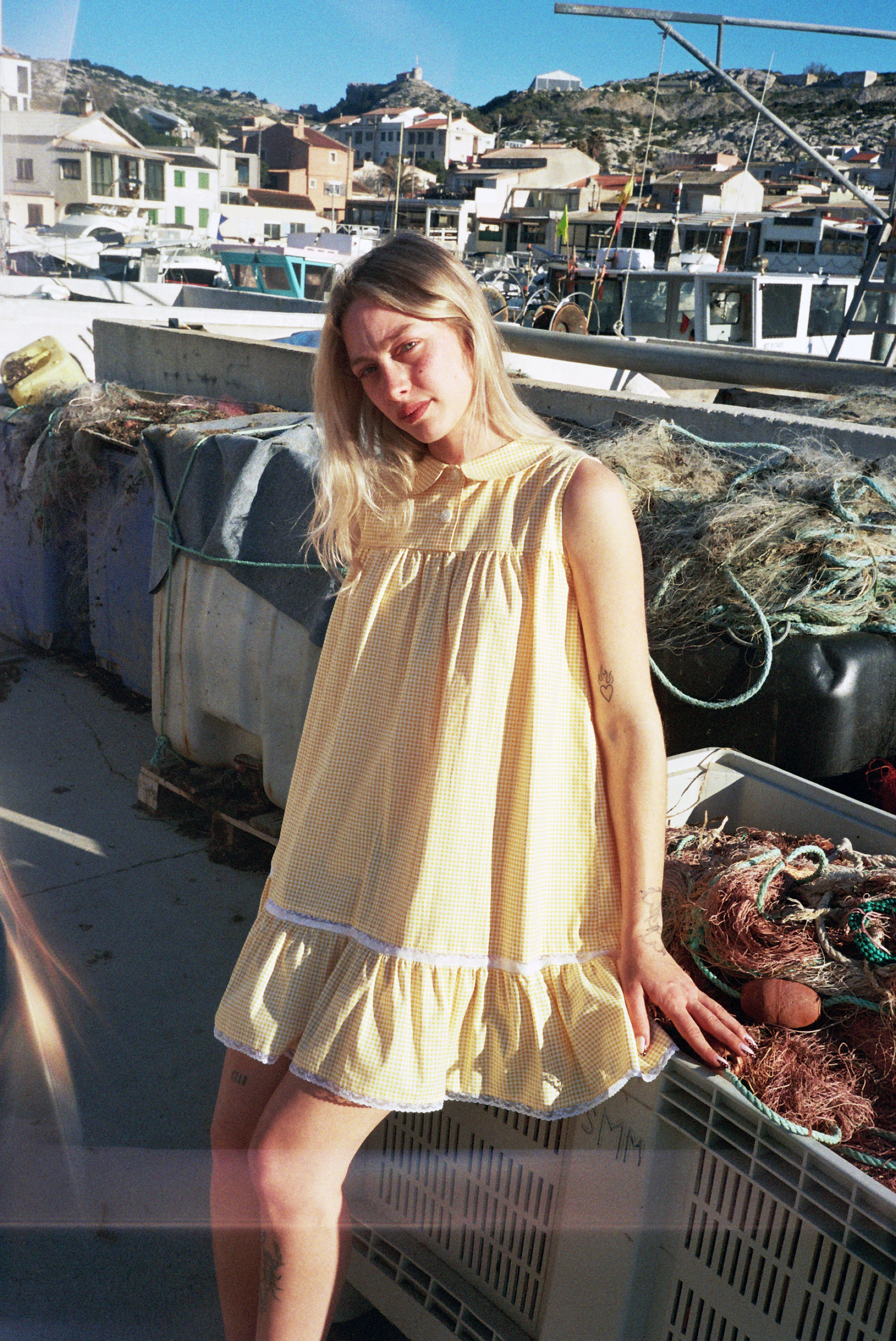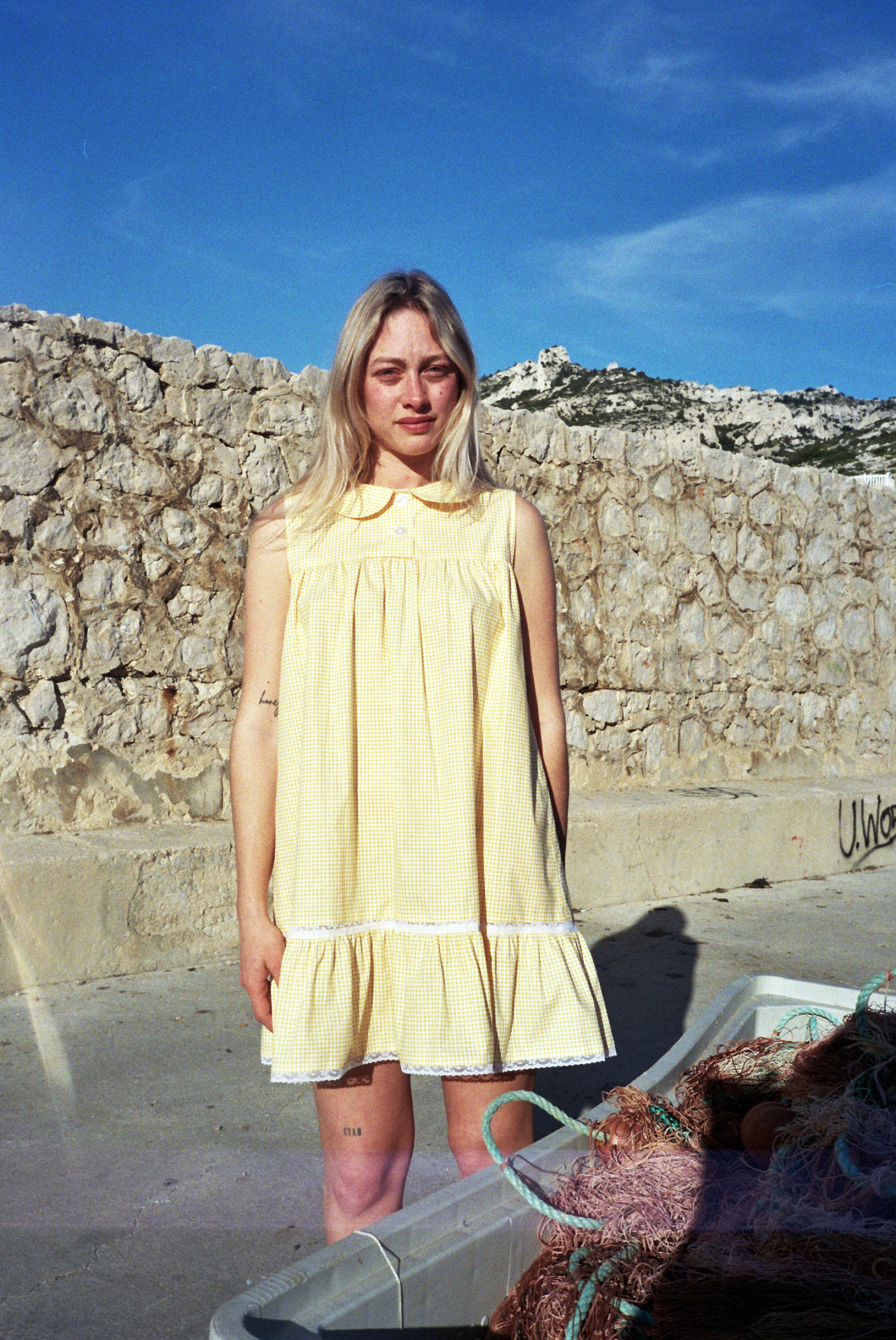 Robe en coton vichy jaune oversize avec dentelle de Calais fleurie.