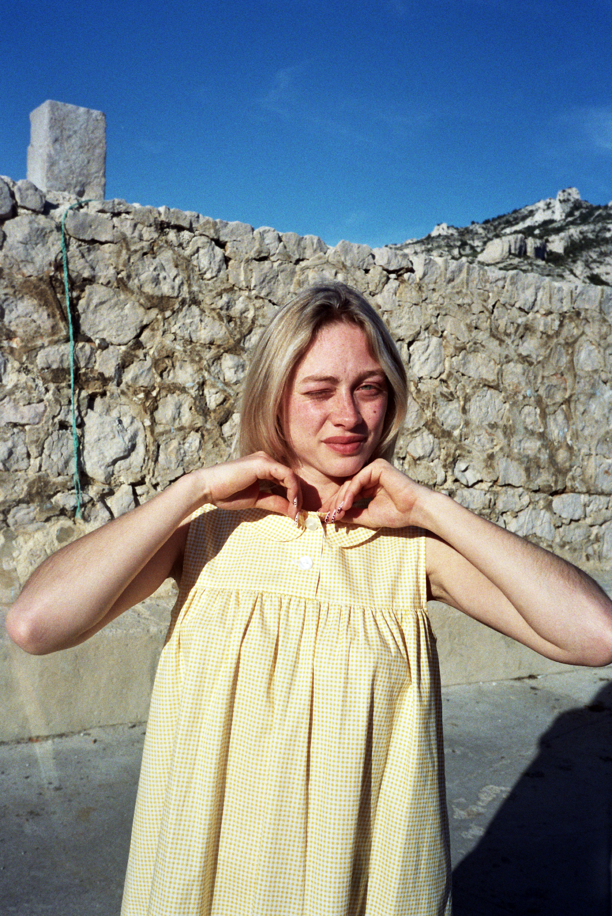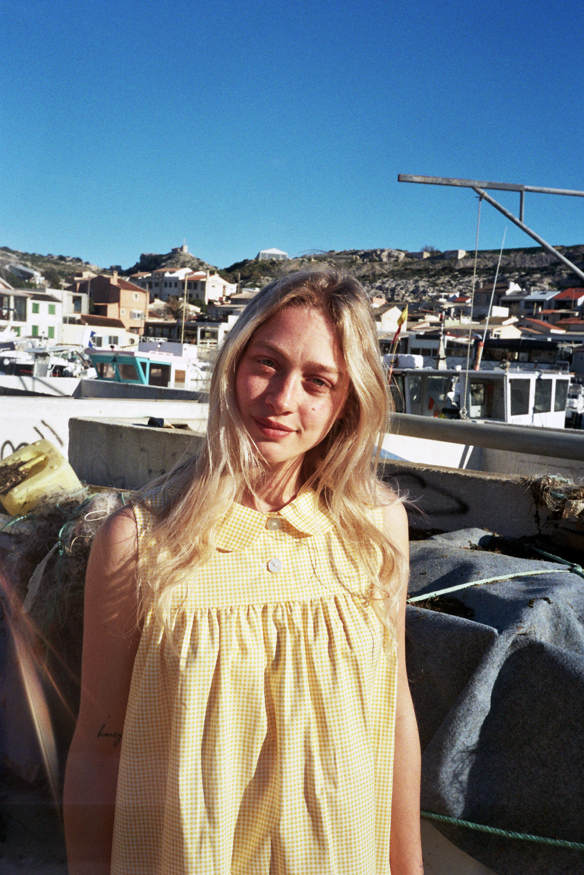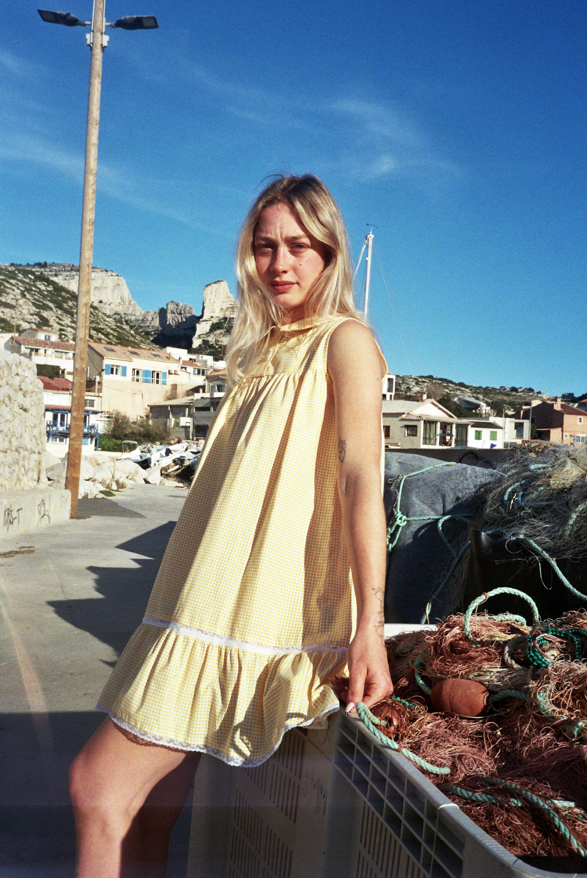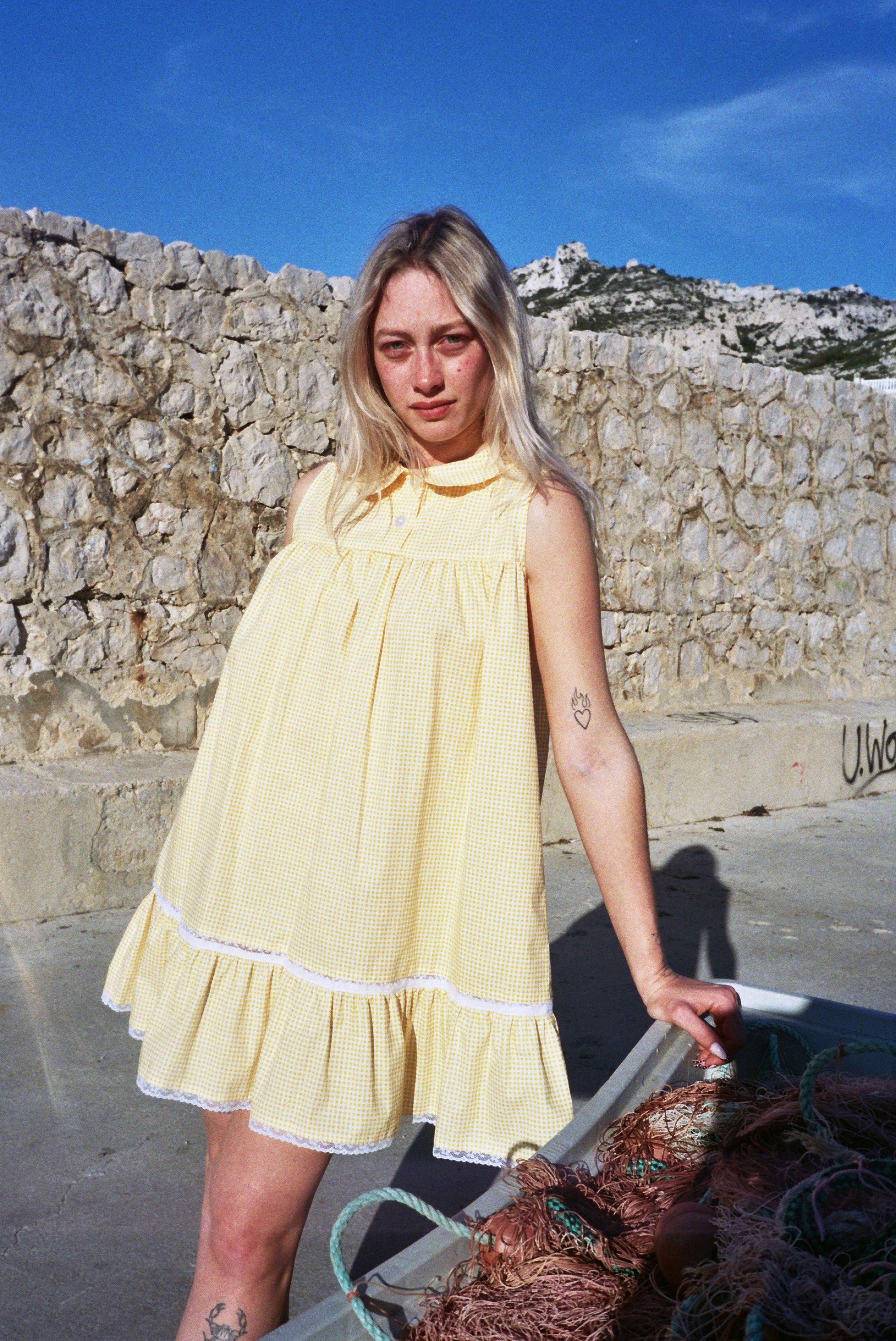Robe en coton vichy jaune oversize avec dentelle de Calais fleurie.