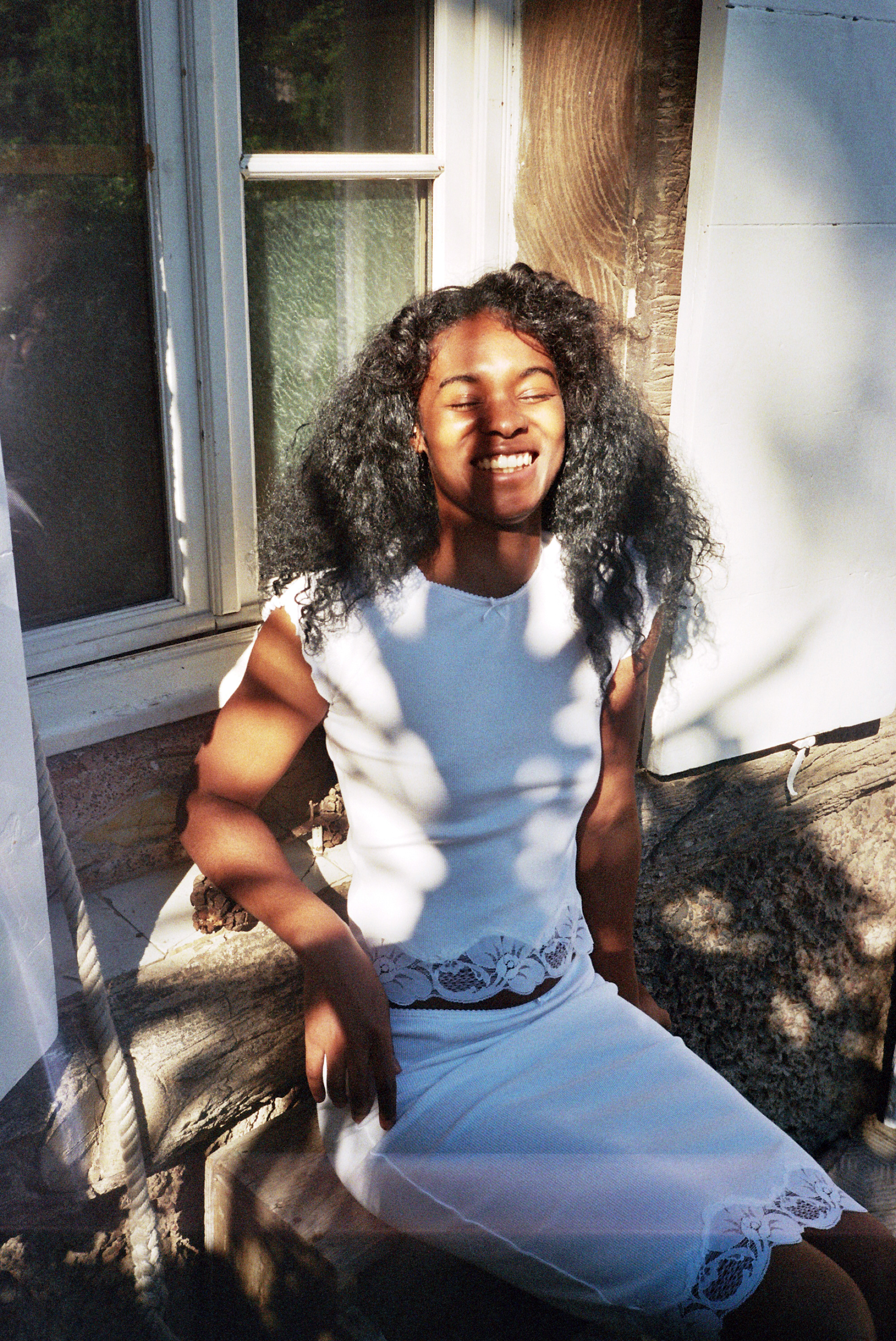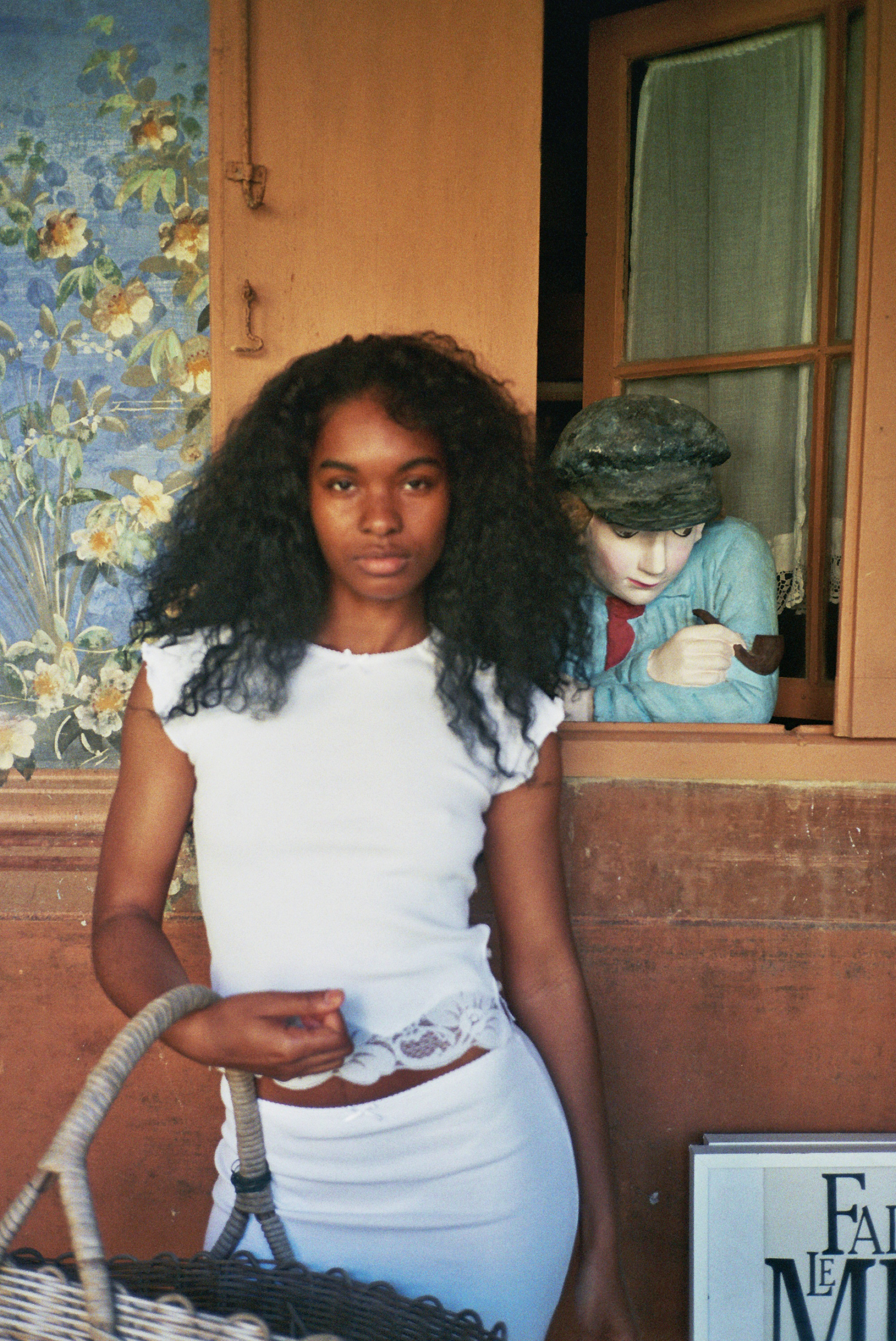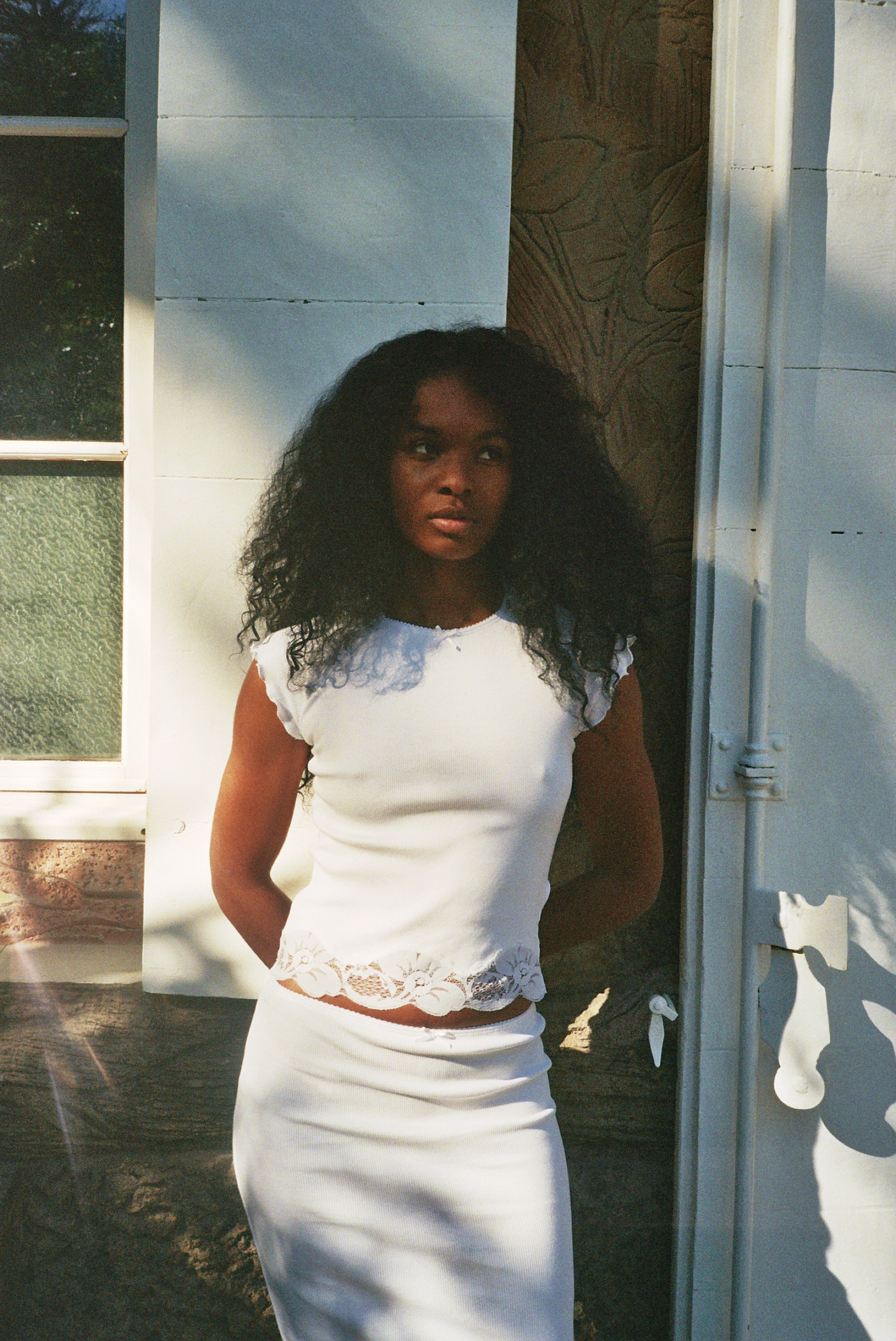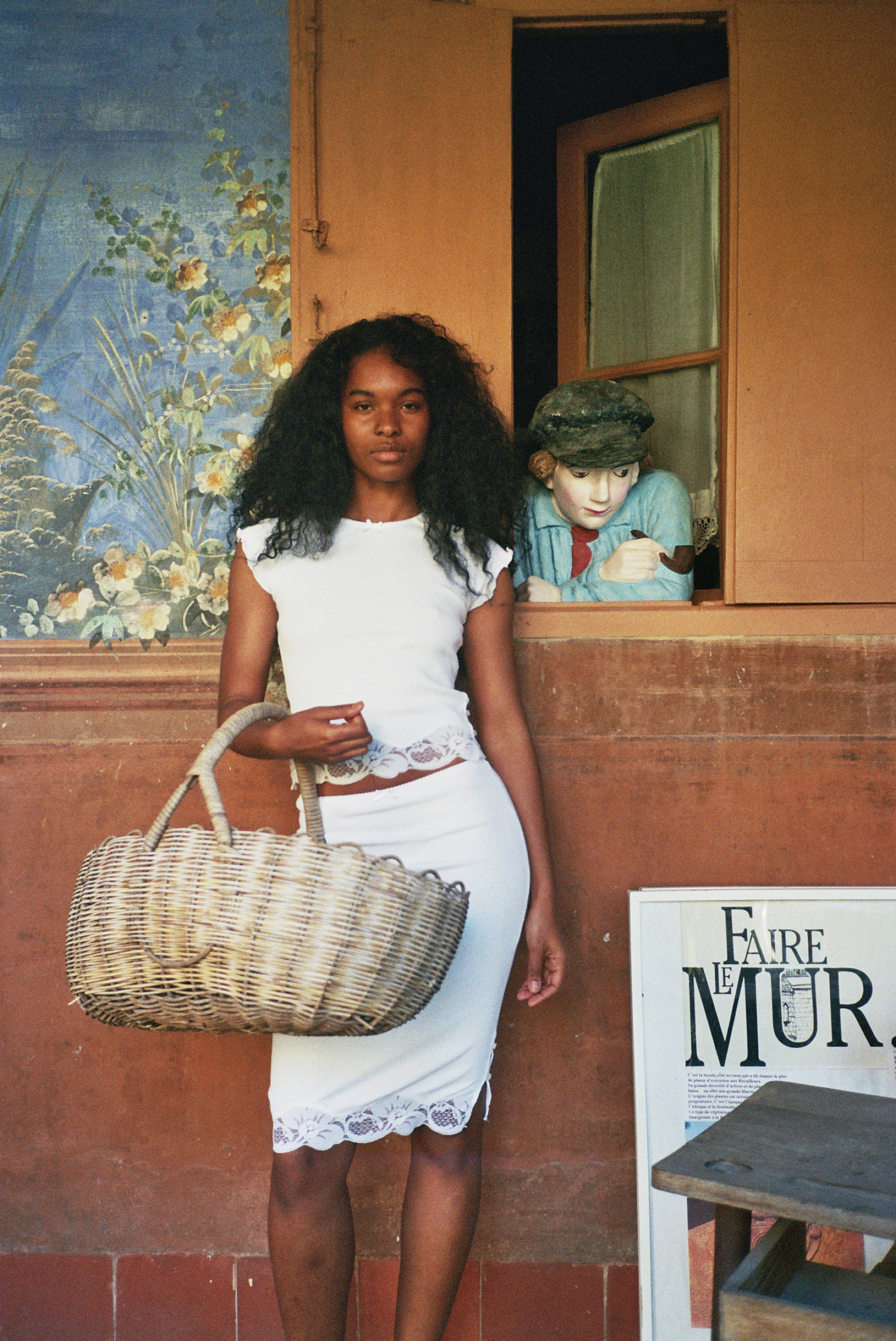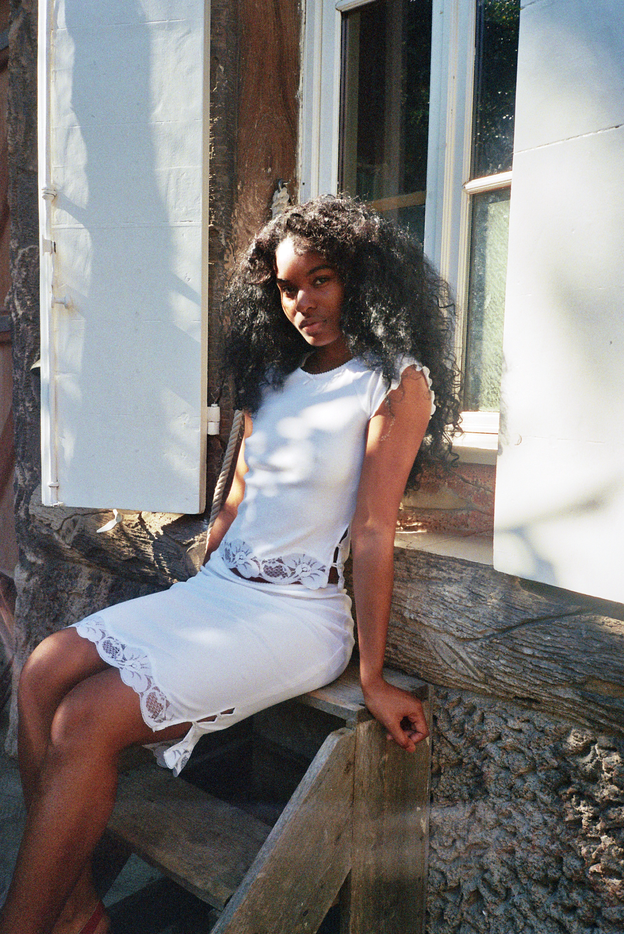 Jupe en jersey de coton blanc avec dentelle de Calais dans le bas, boutonnée sur le côté, petit noeud sur la taille.