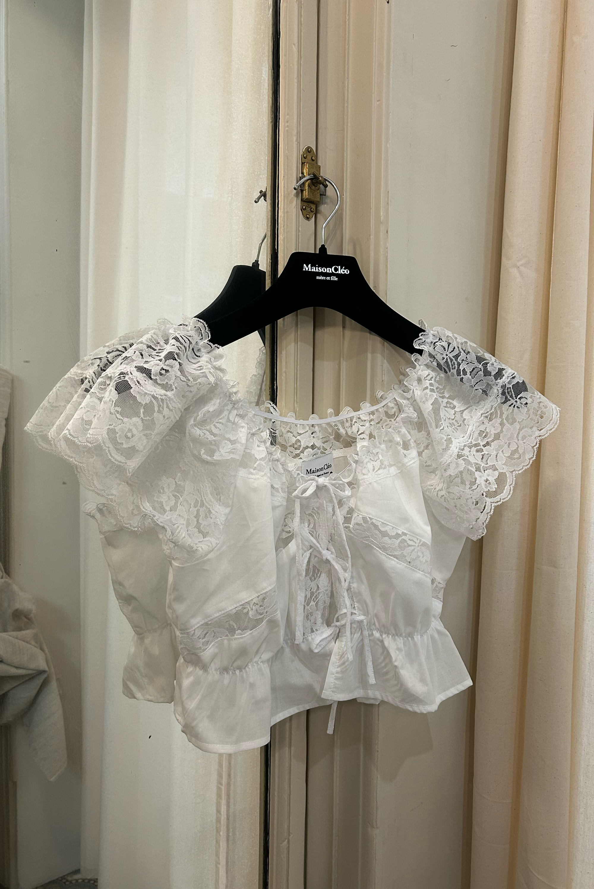 Antique flowers lace short sleeves blouse with ruffles around the neckline.
