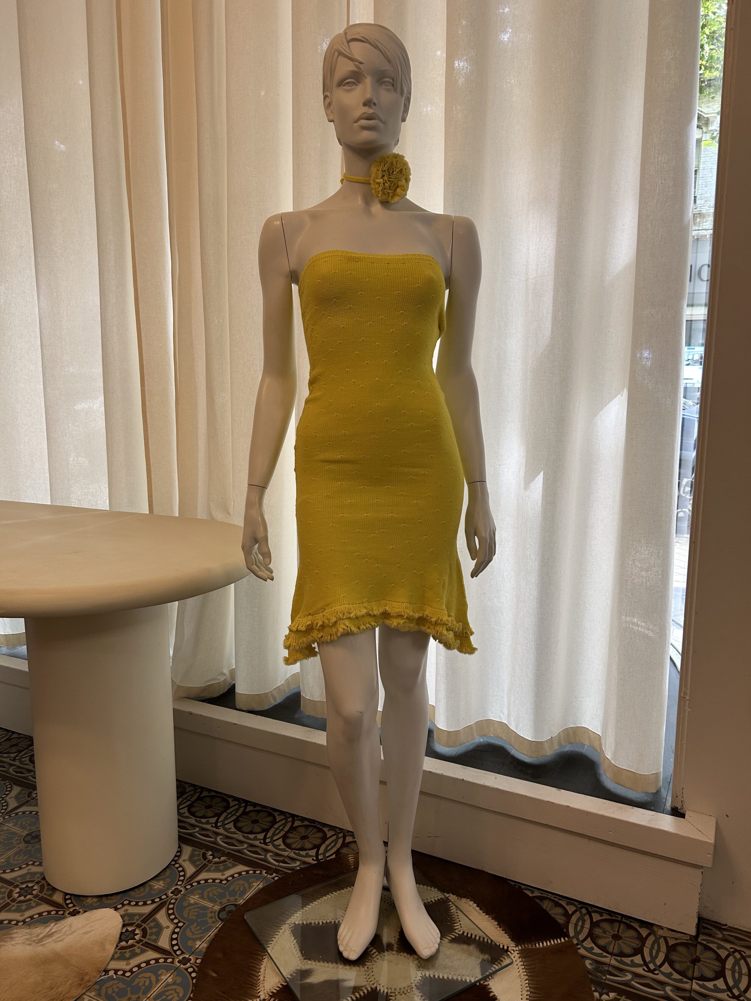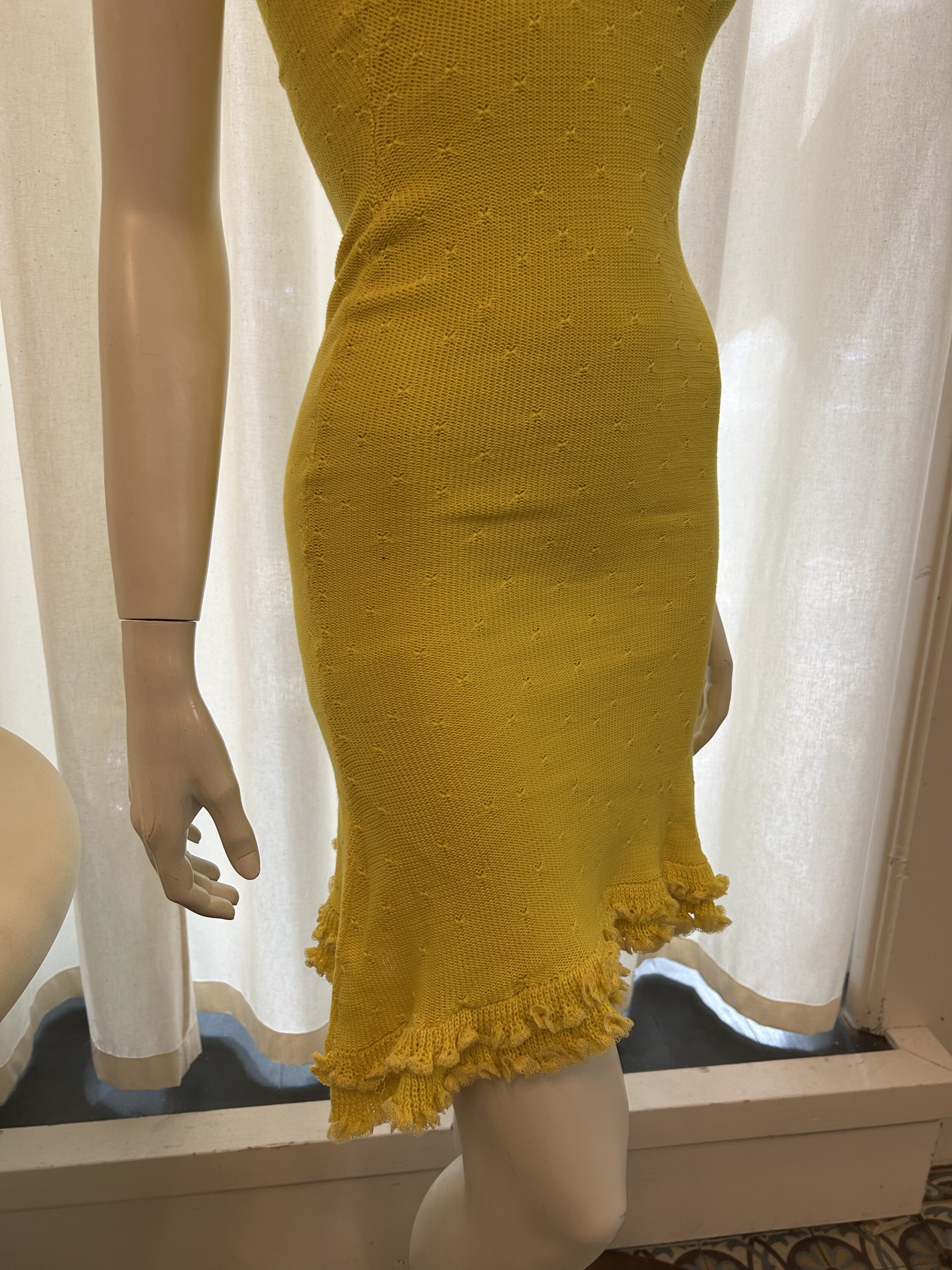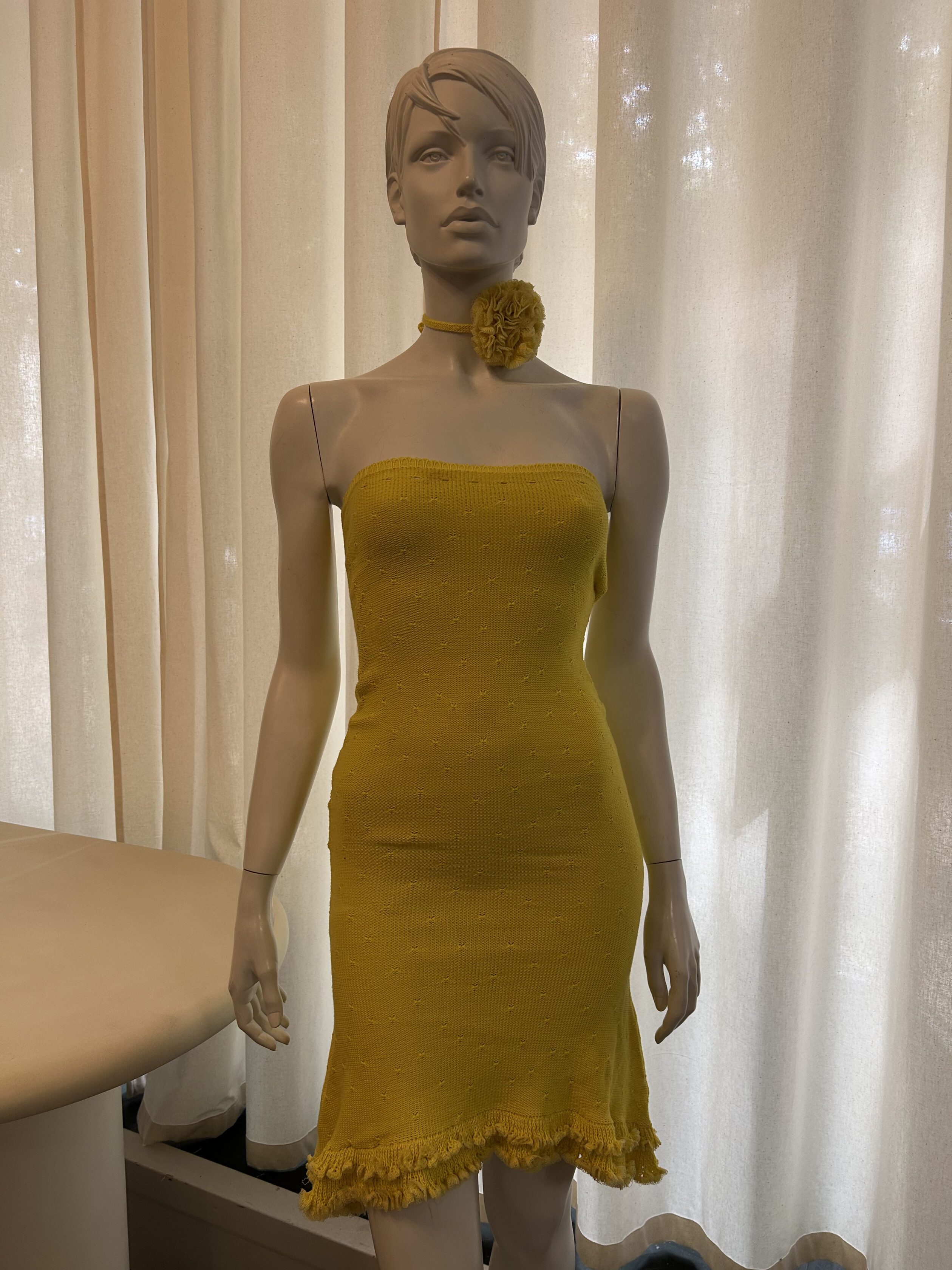 Yellow sun cotton knitted dress with ruffles and flower necklace. 100% organic cotton. Handknitted in our atelier.
