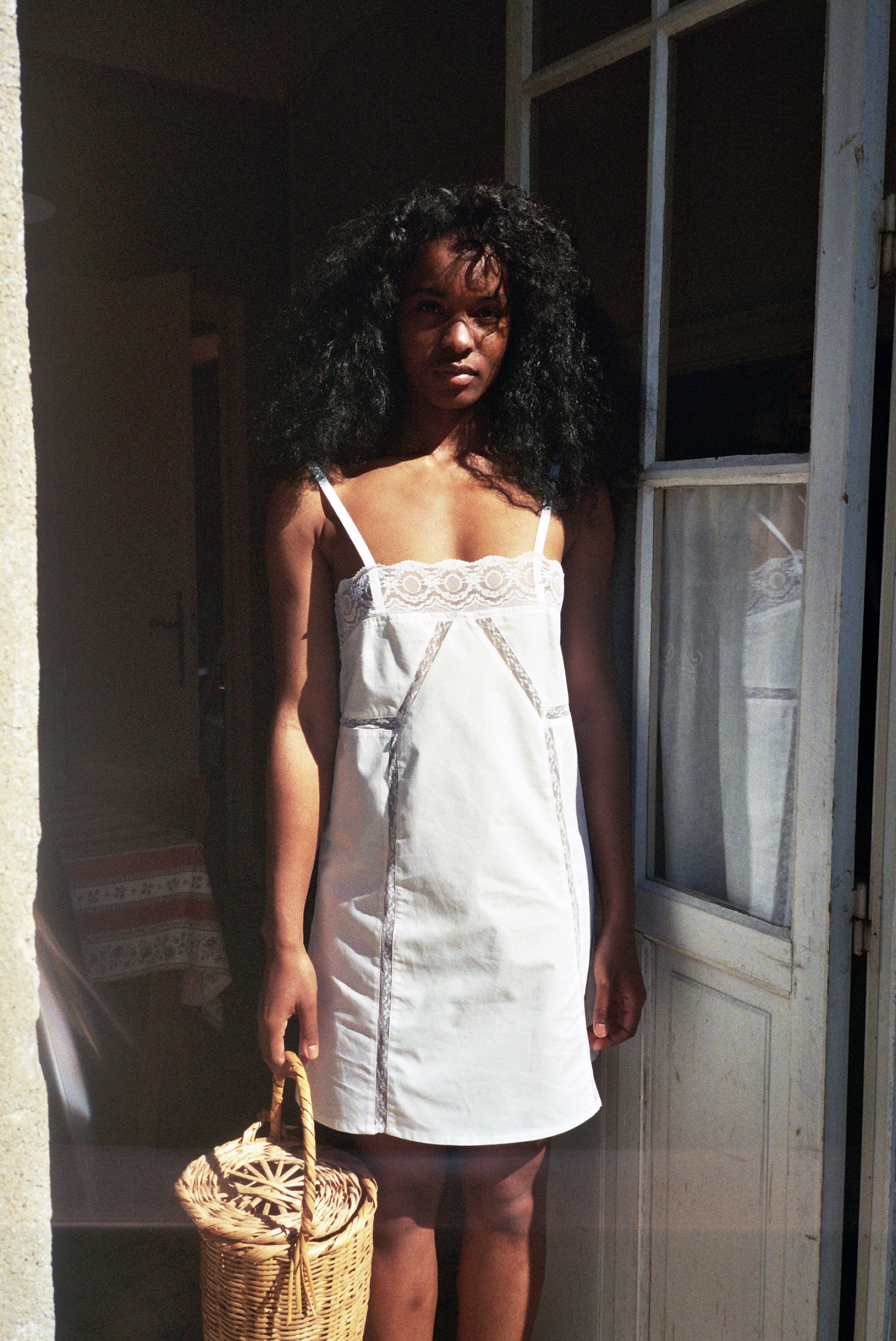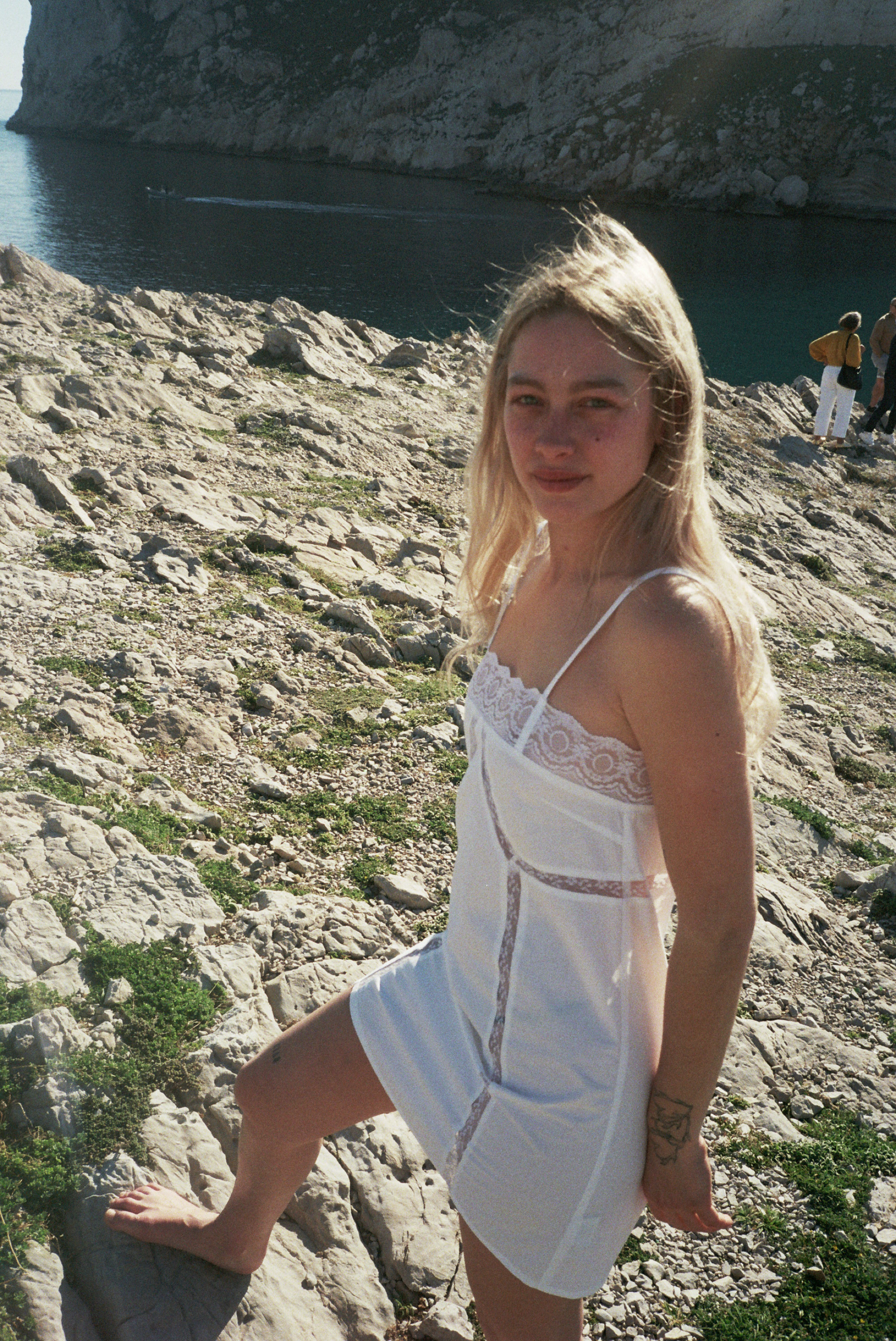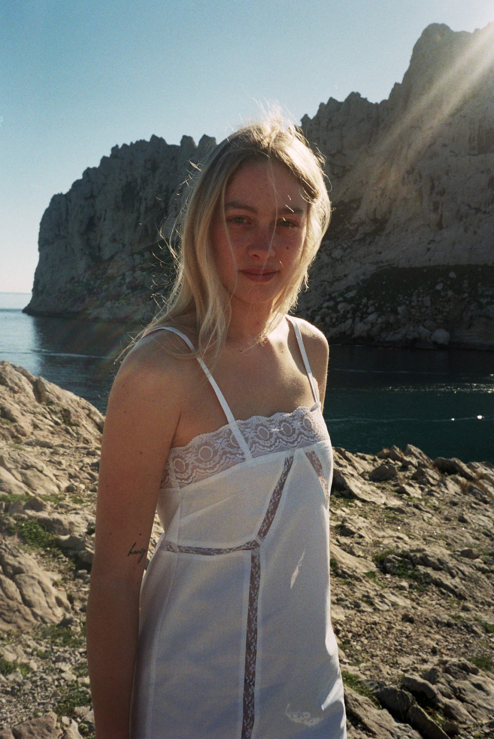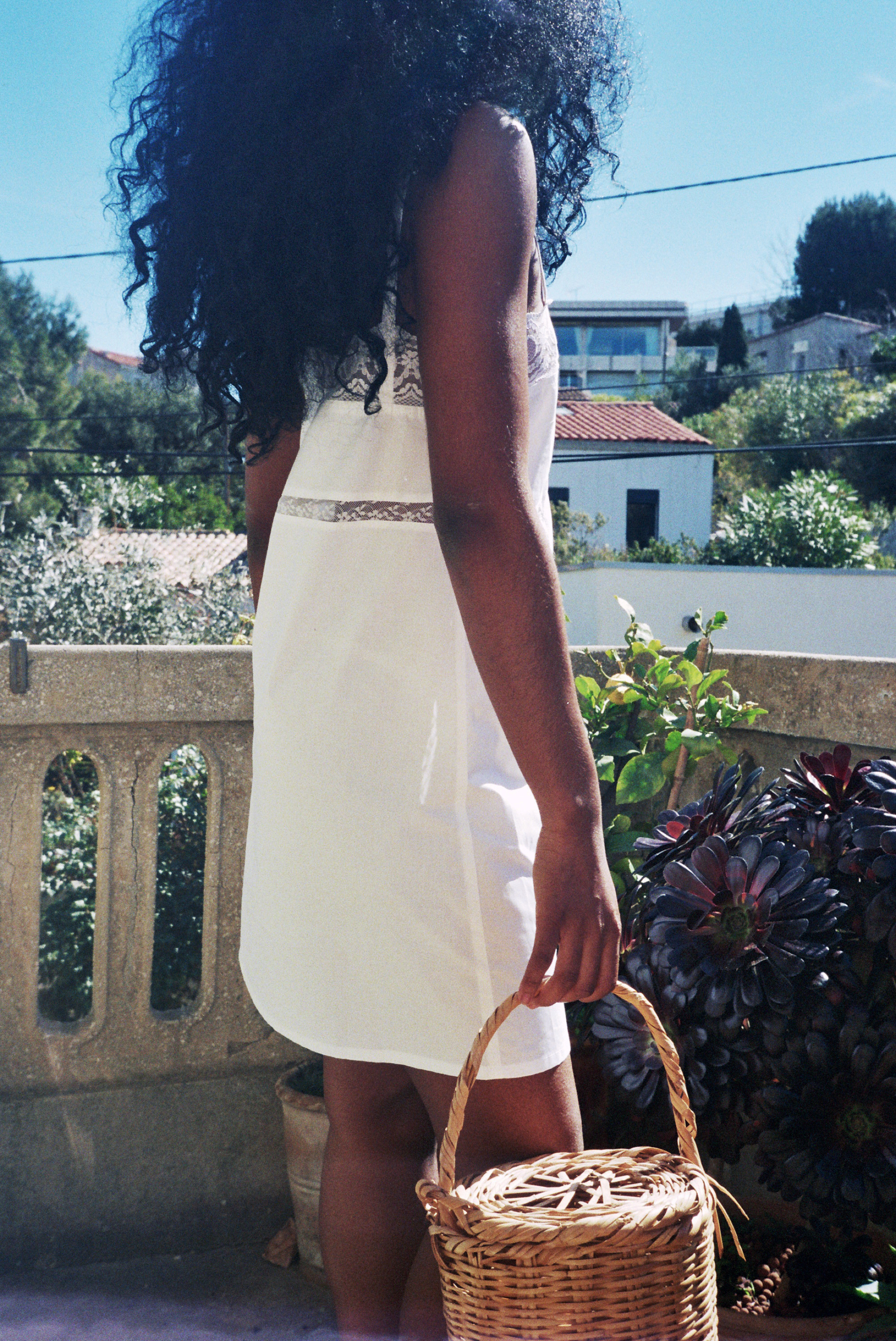 Straps, slightly flared bottom, delicate real Calais flowers lace parts. 100% cotton.