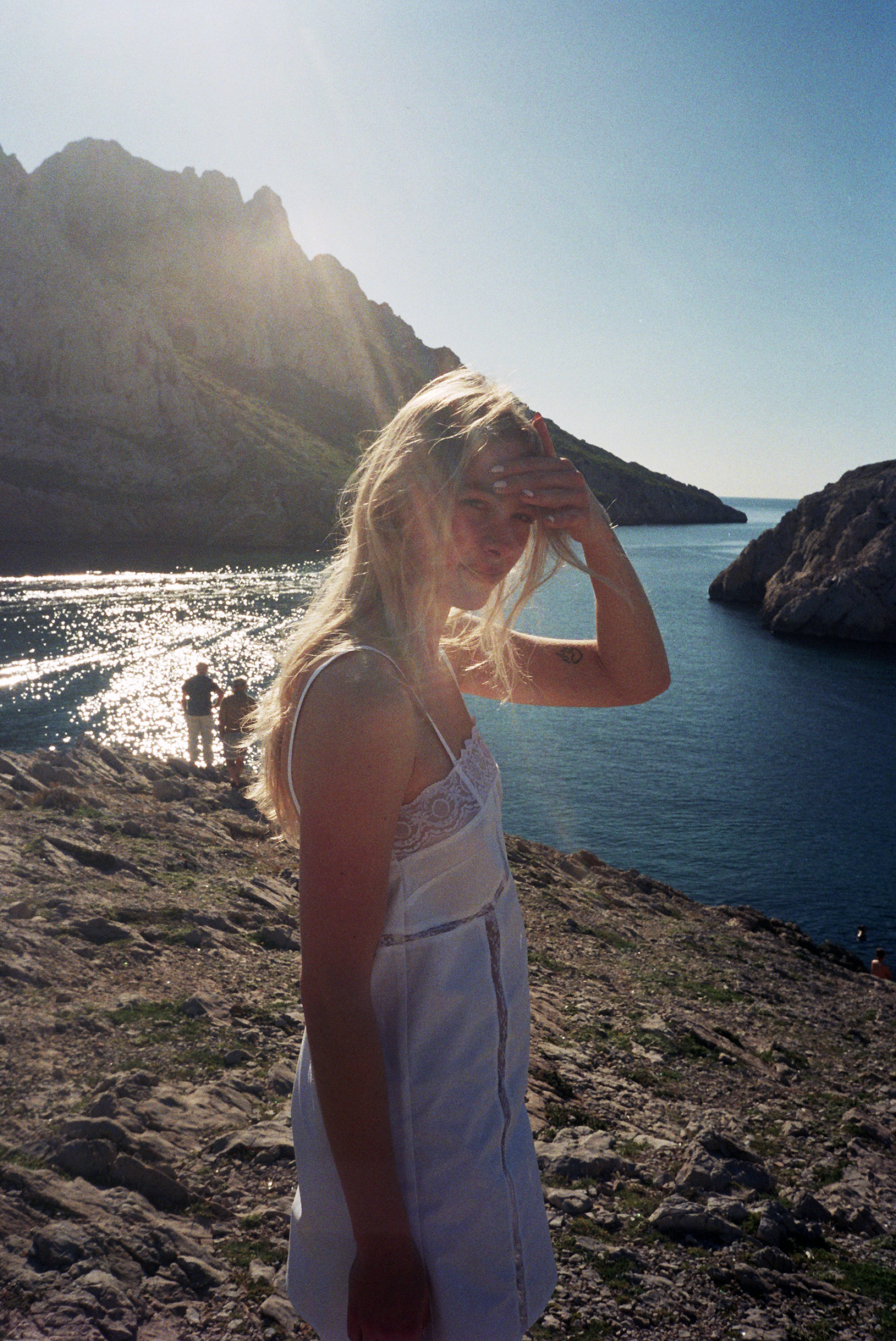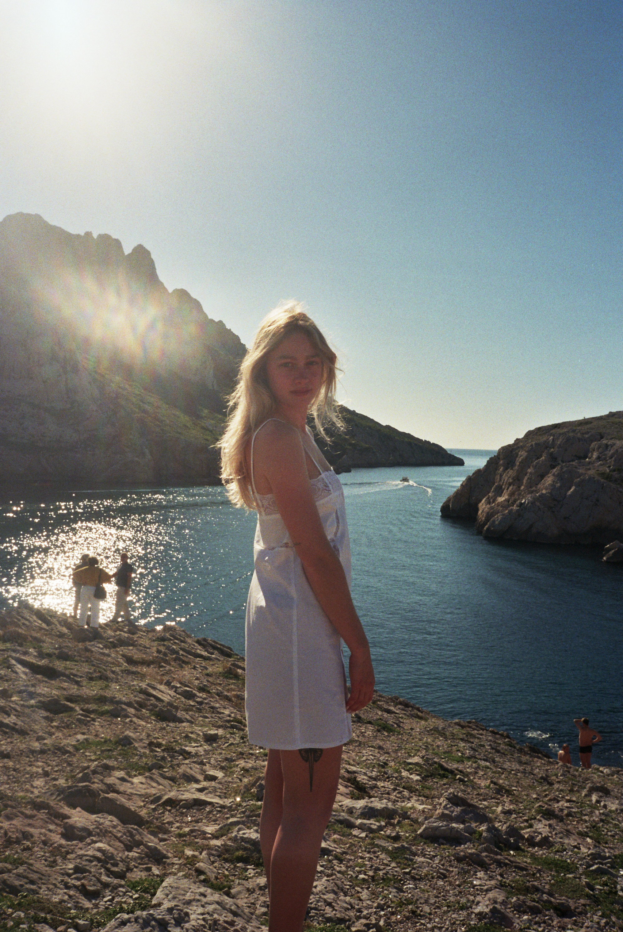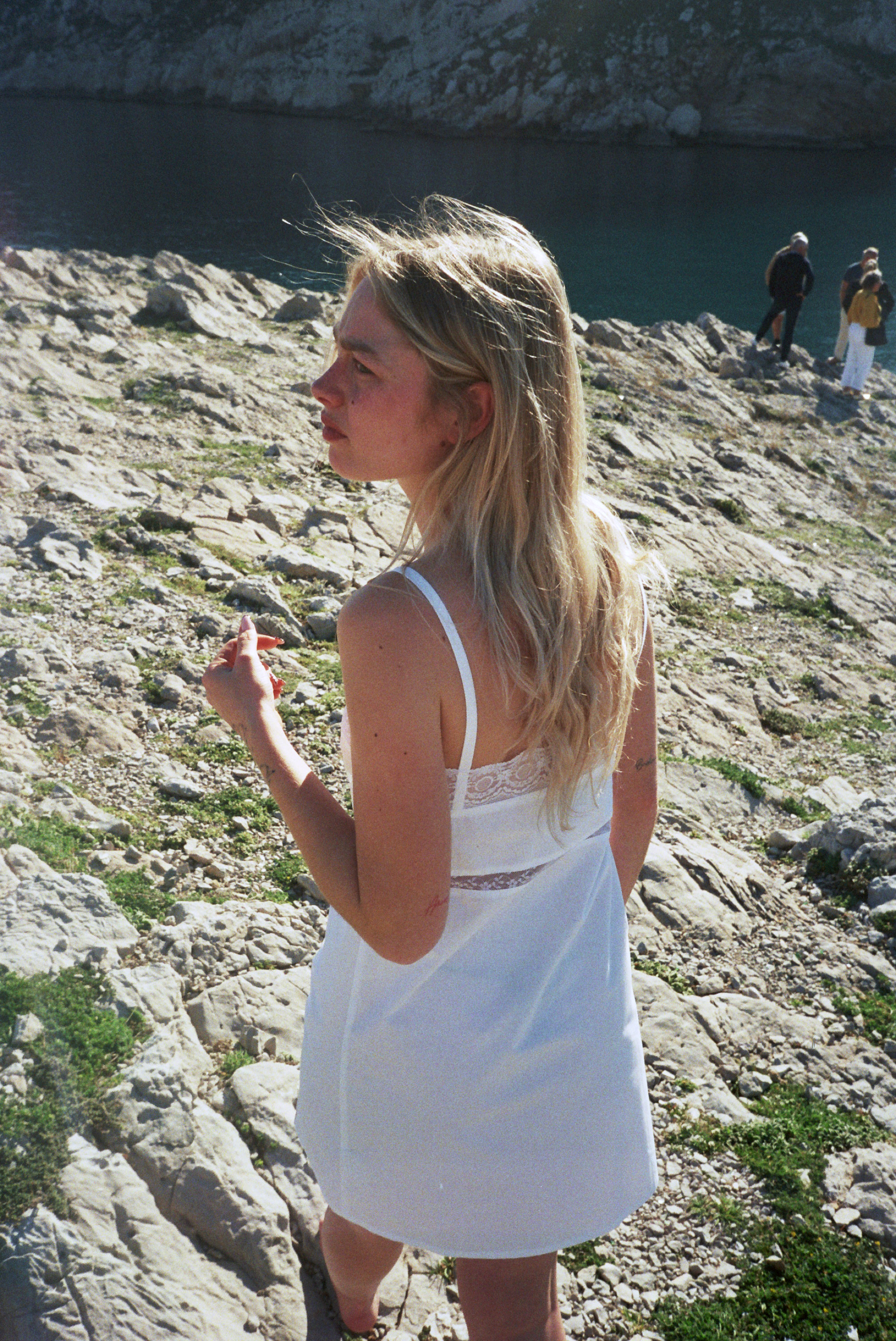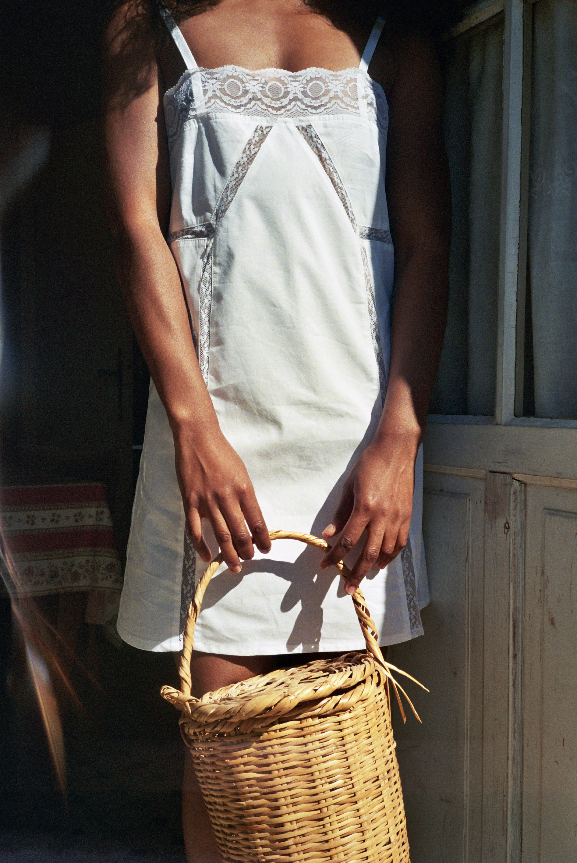 Straps, slightly flared bottom, delicate real Calais flowers lace parts. 100% cotton.