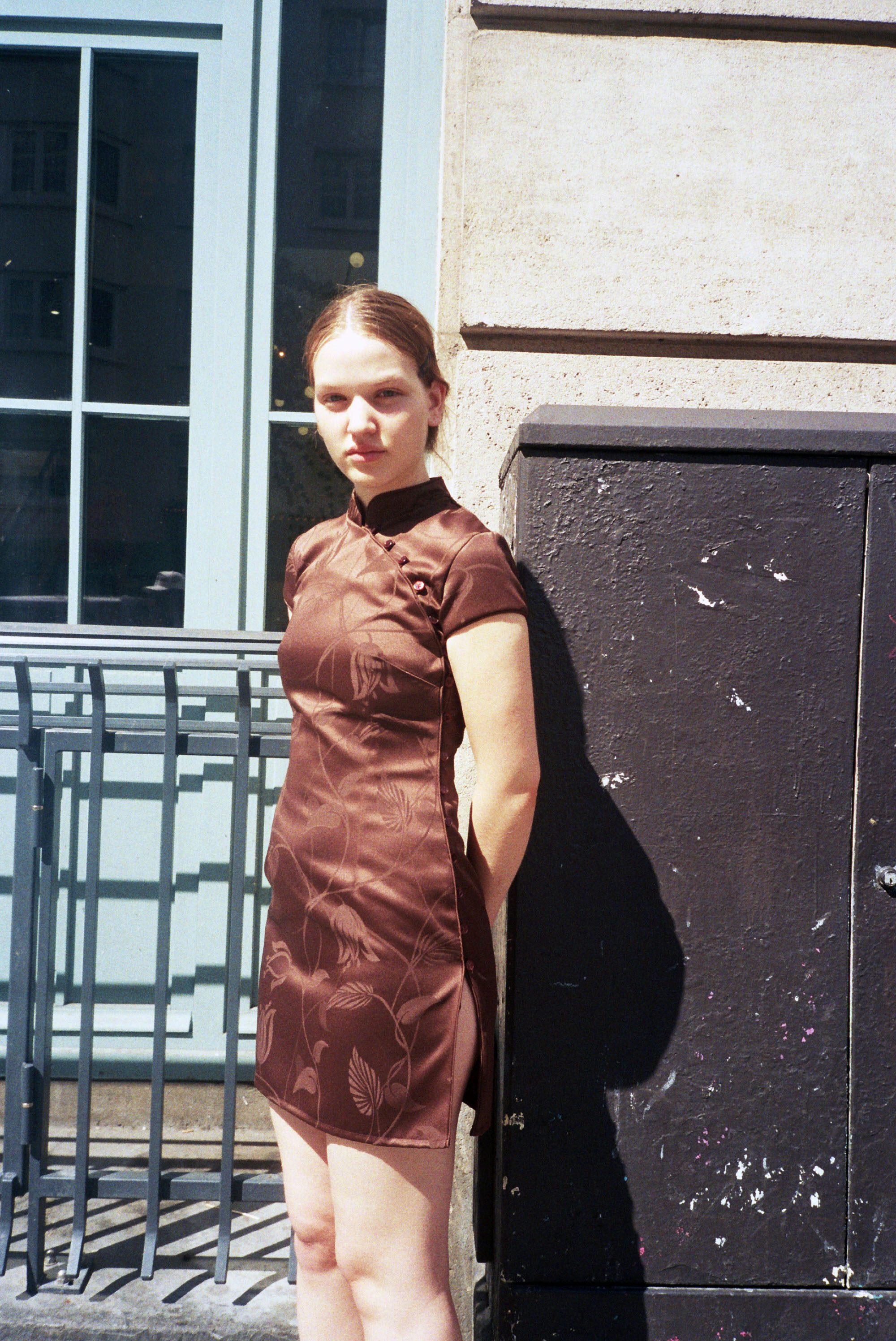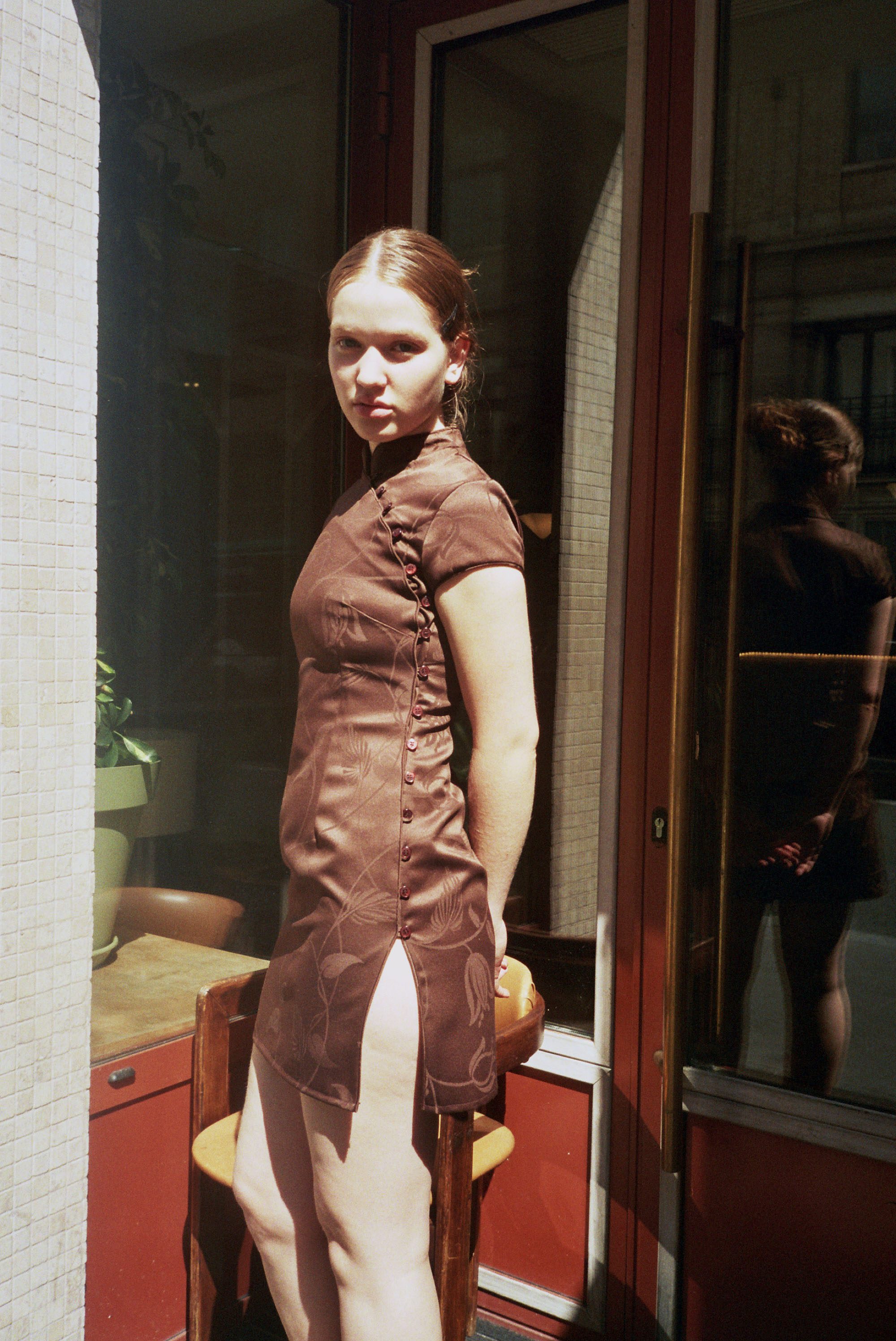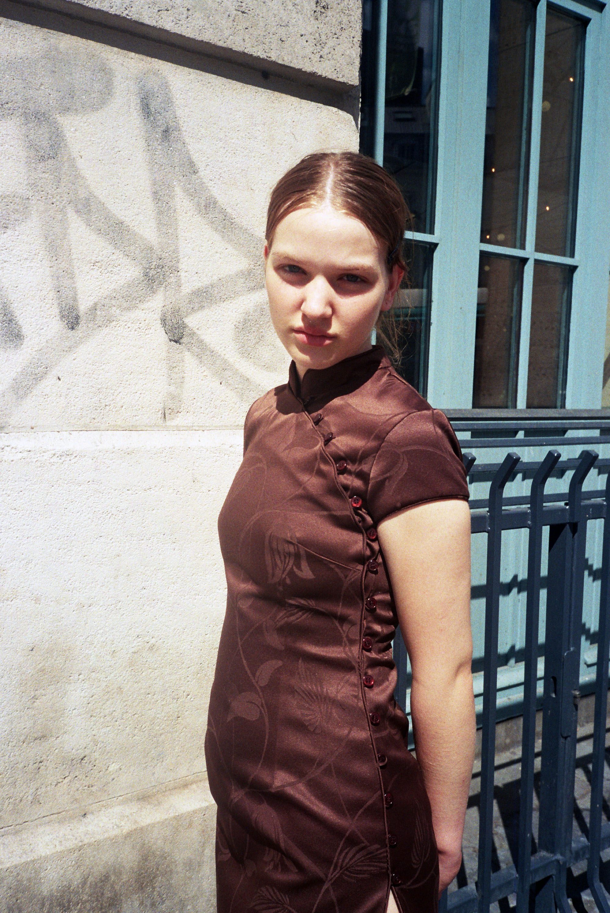Chinese brown patterned silk buttoned dress. Thick duchesse fabric.