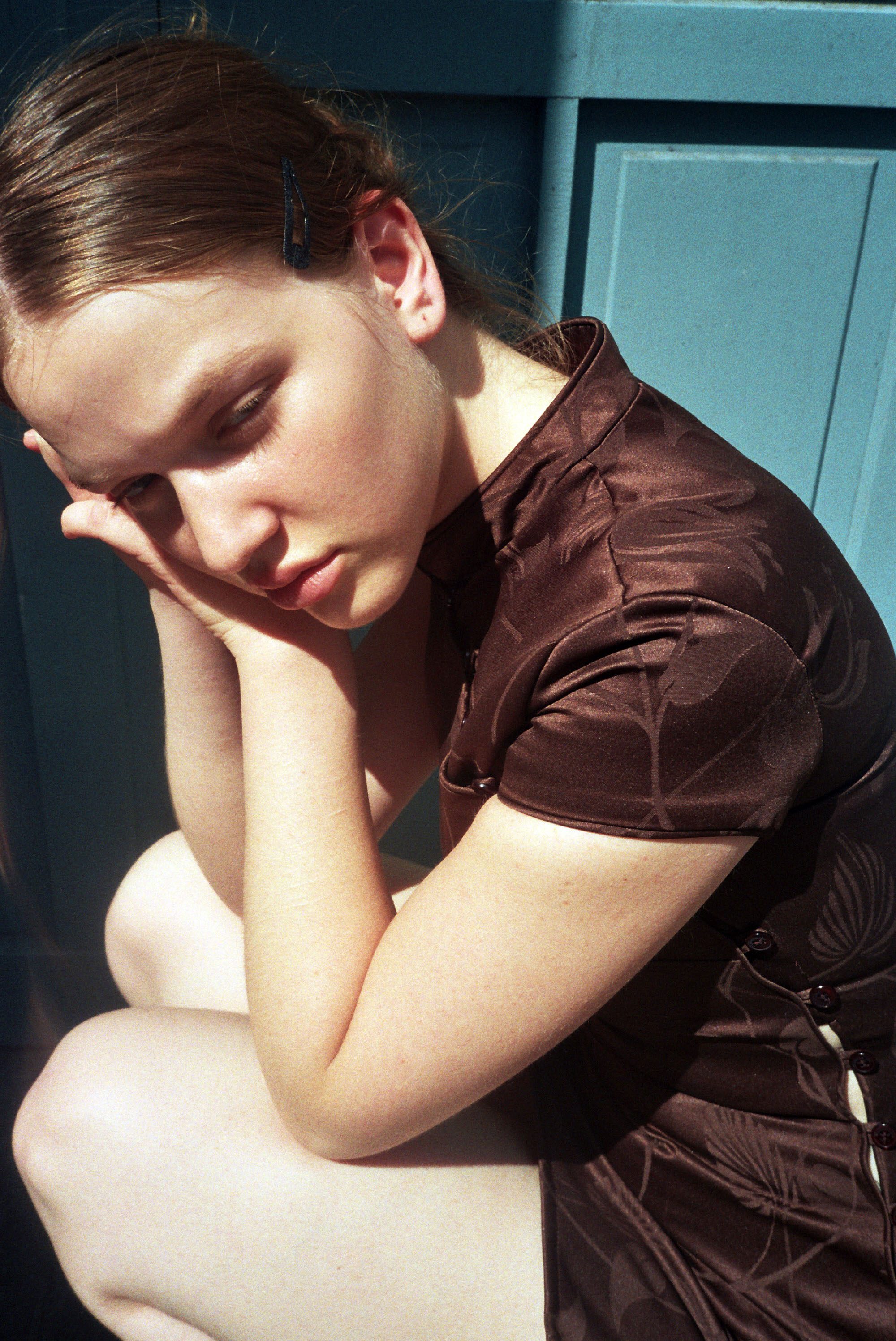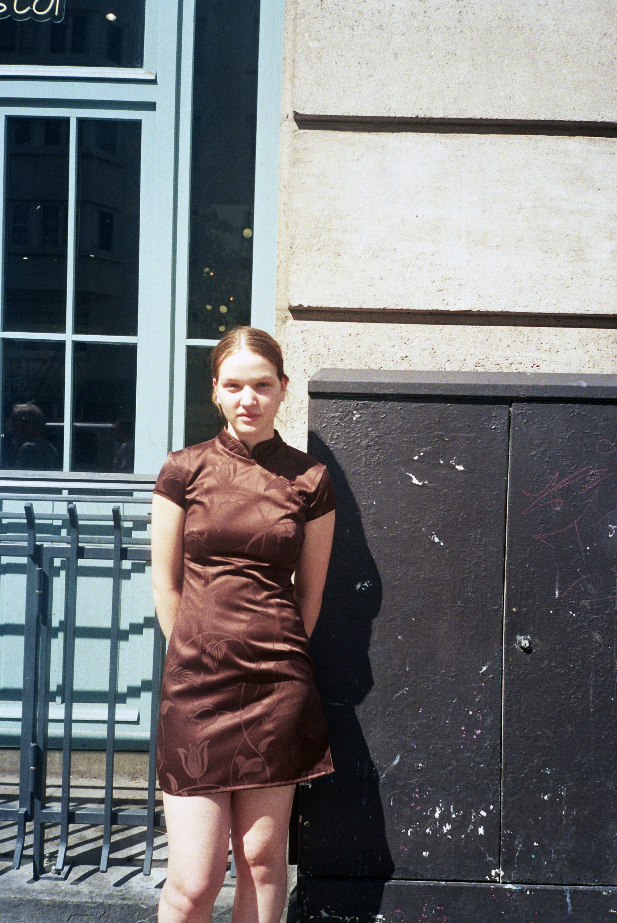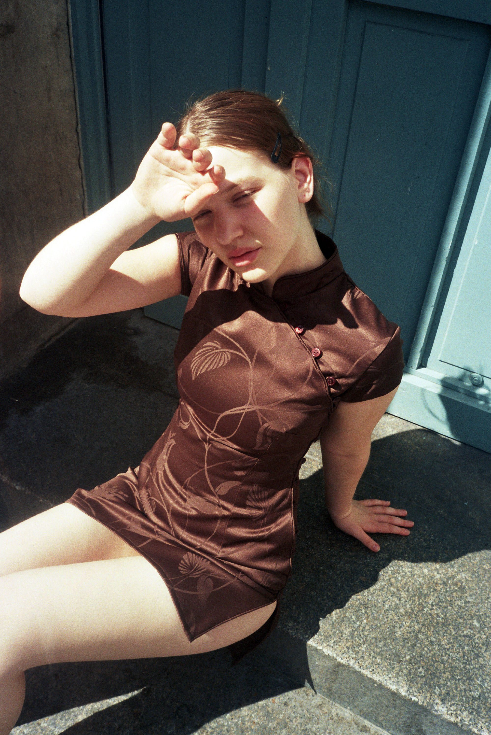 Chinese brown patterned silk buttoned dress. Thick duchesse fabric.