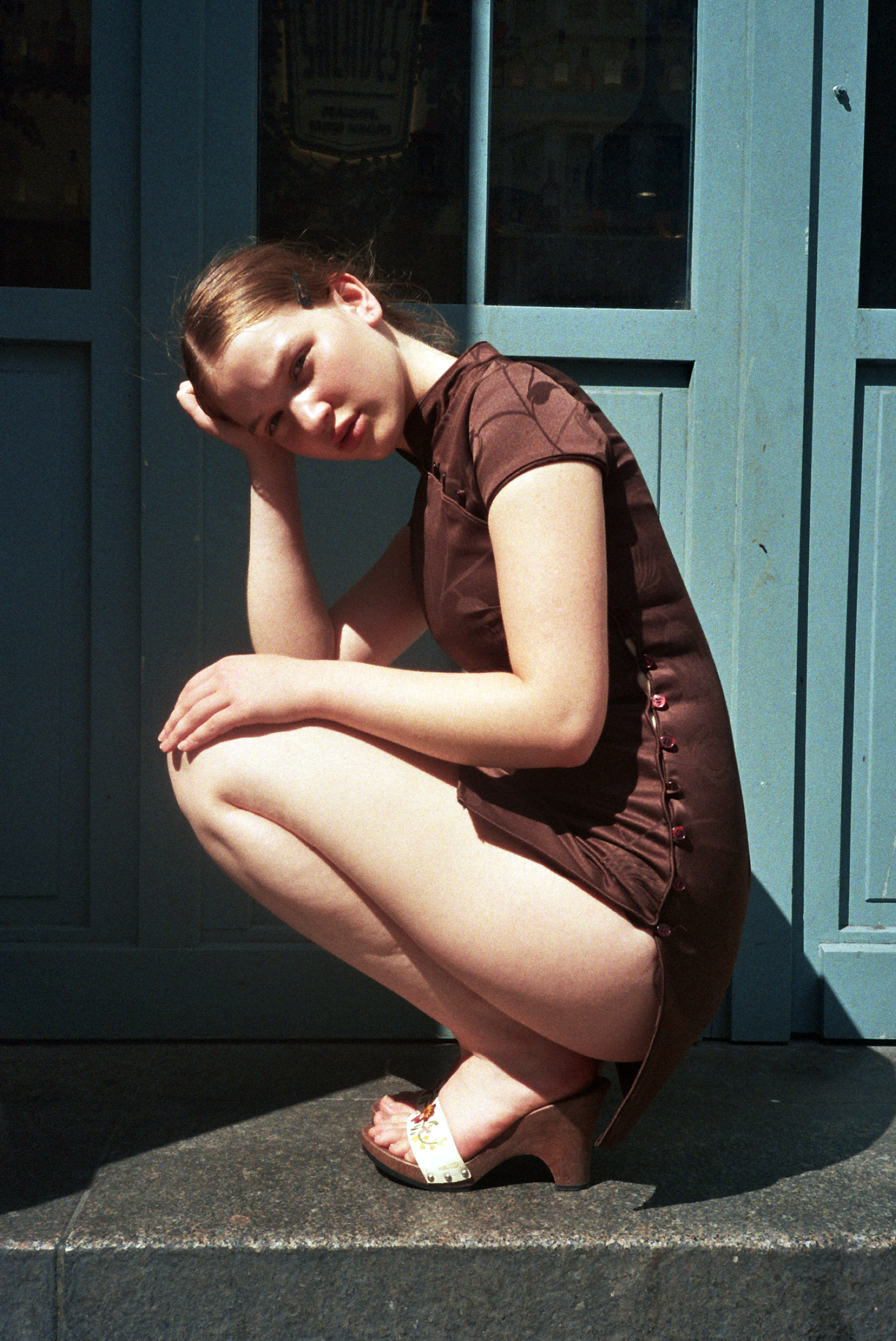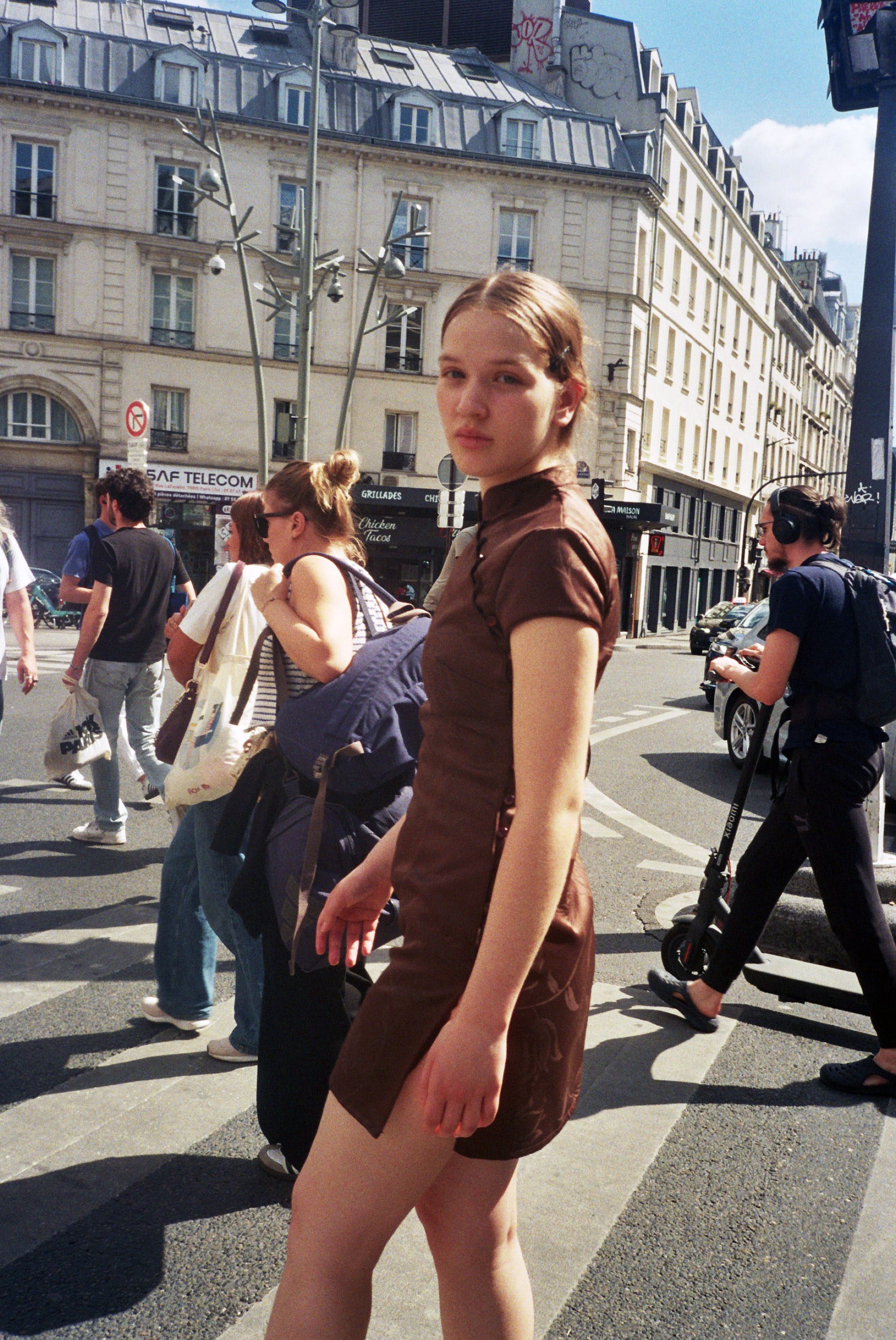 Short sleeves, opened collar, entirely buttoned on the side. Brown duchesse silk finishings on the sides with a side slit.