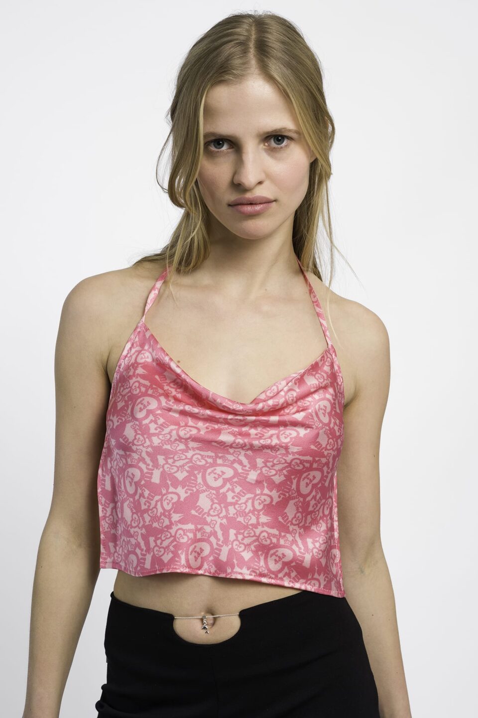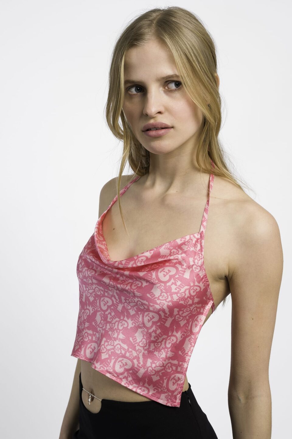 Mid-rise black trousers with a piercing chain cut-out at the waist. As if you had a pierced belly button without having a pierced belly button… Fluid fabric, zip closure on the side, slightly bootcut on the bottom.